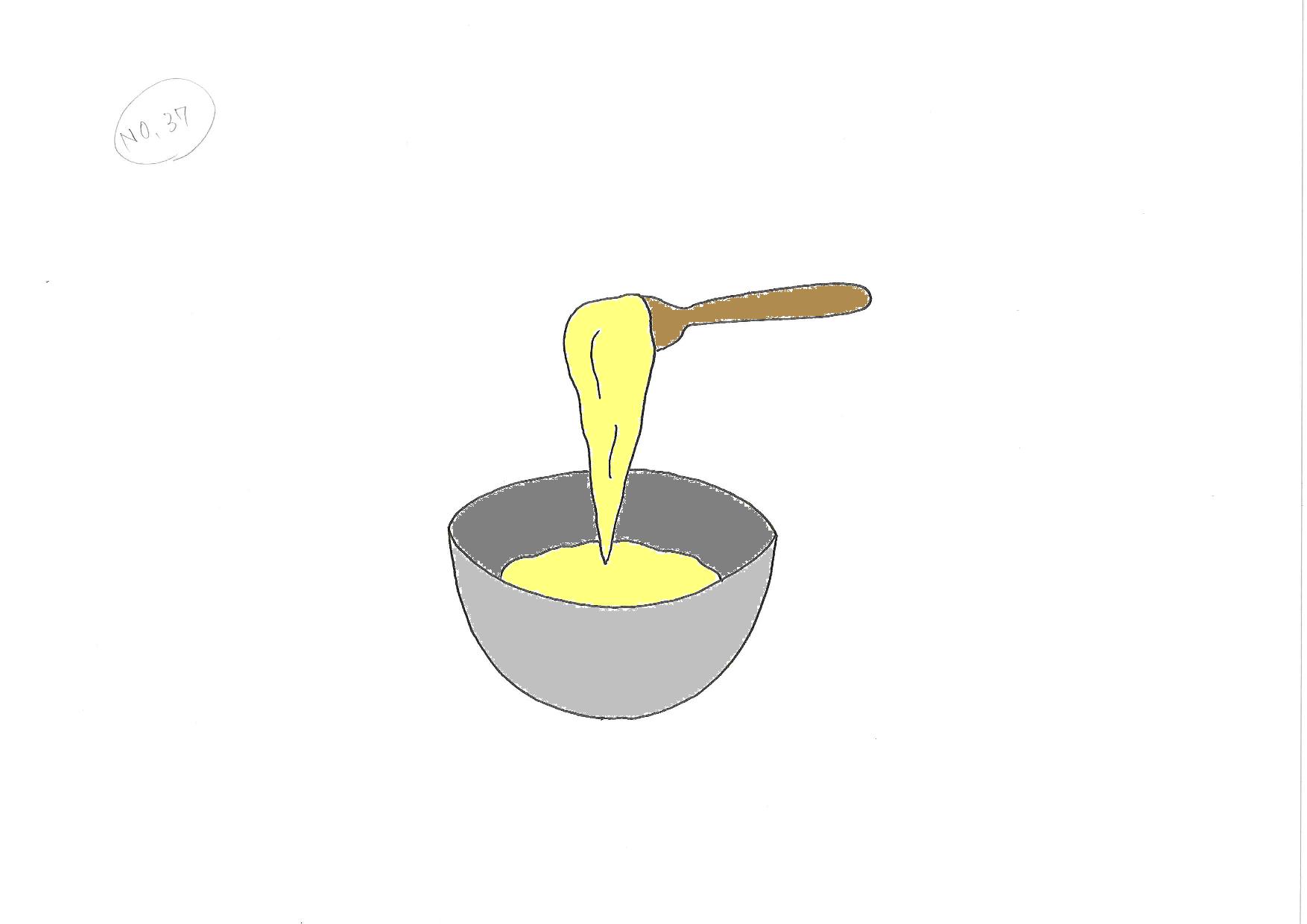 出来上がりの生地の状態は木ベラで生地をすくい下に落とす。その時きれいな三角形を描くと丁度よい生地の固さ。