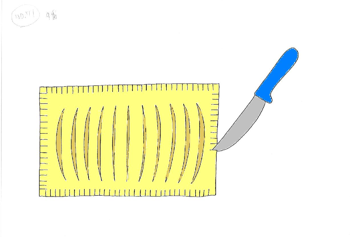 もう一枚のパイ生地(大きい生地)をタテ半分に折りたたみ、輪になるほうを手前にしておき、左右と上を2cmあけ、7、8mm間隔でナイフで切れ目をいれる。