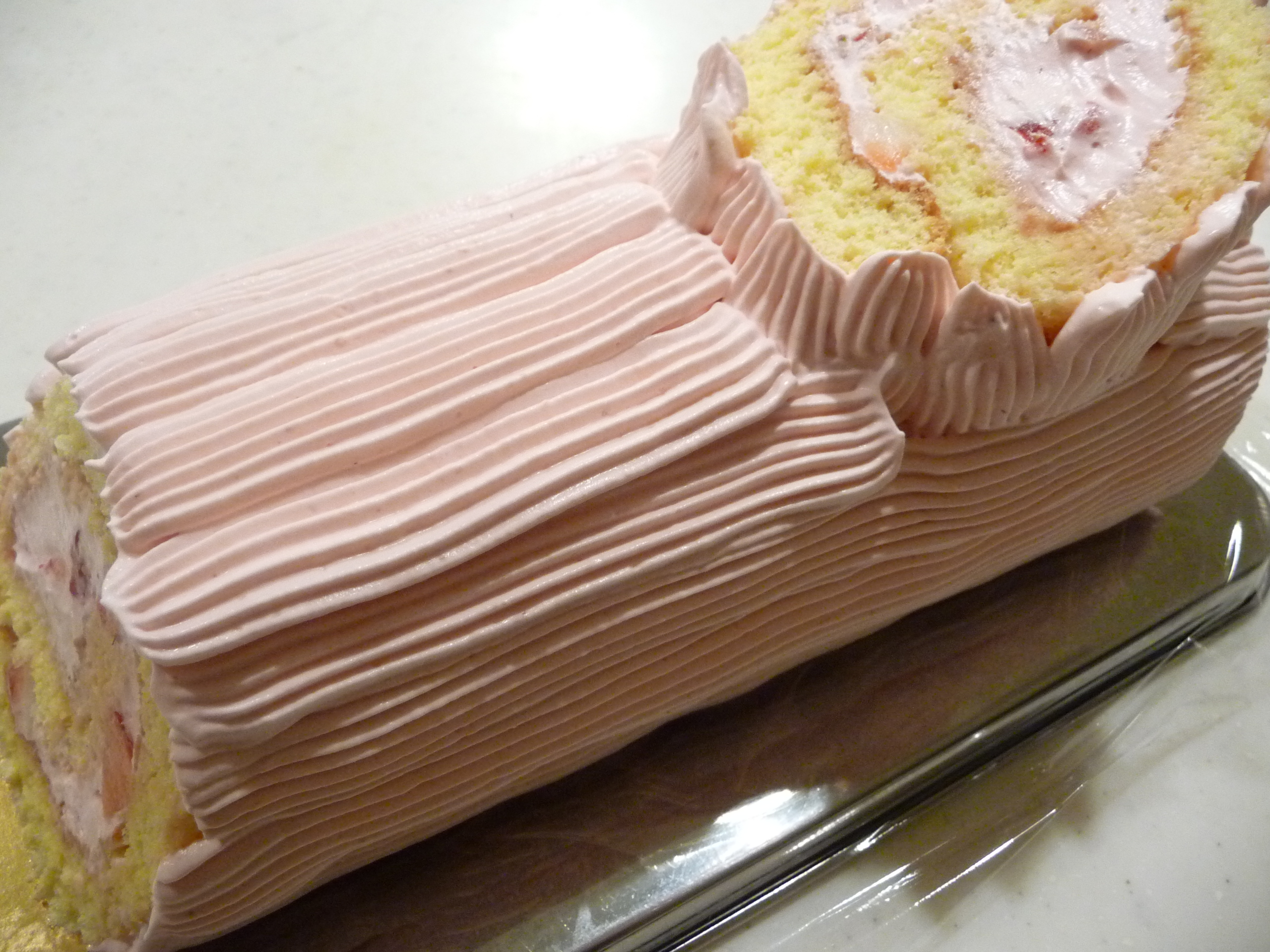残りのクリームを平口金をつけた絞り袋にいれ、ロールケーキ全体が隠れるように絞る。