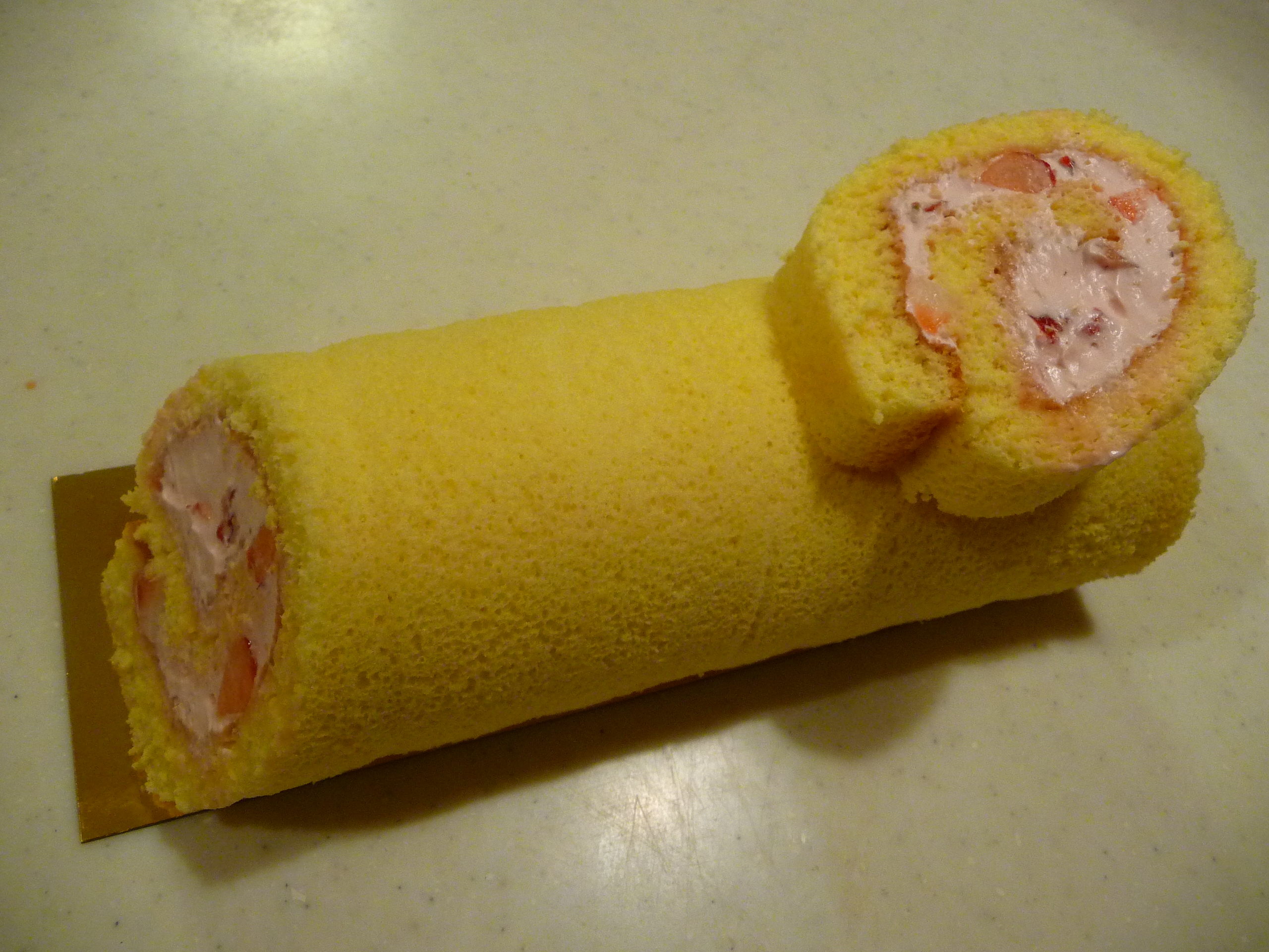 冷蔵庫から出し、端から3cmくらいのところから斜めにケーキを切り落とし、ロールケーキの上に渦巻きが見えるようにのせる。