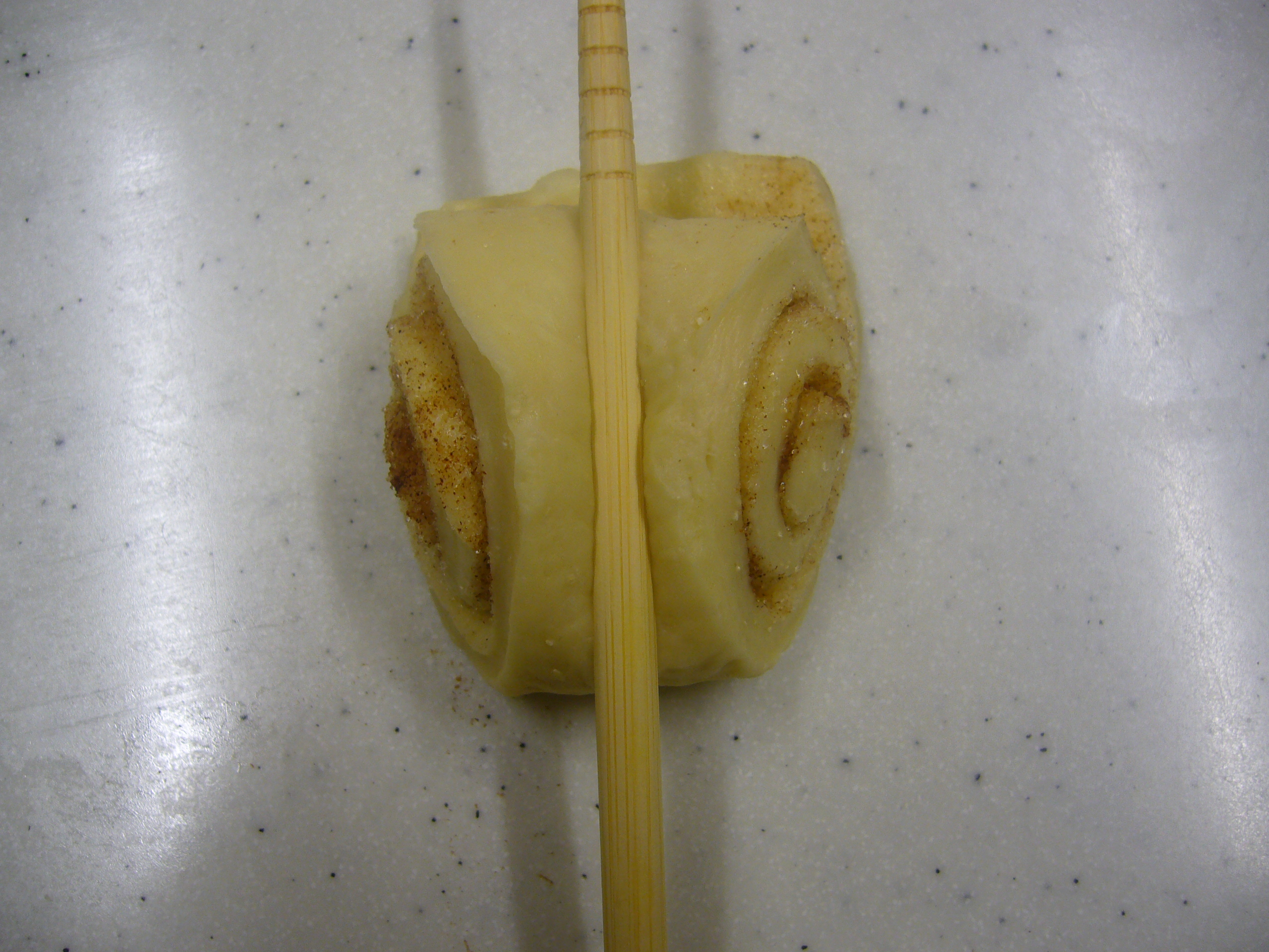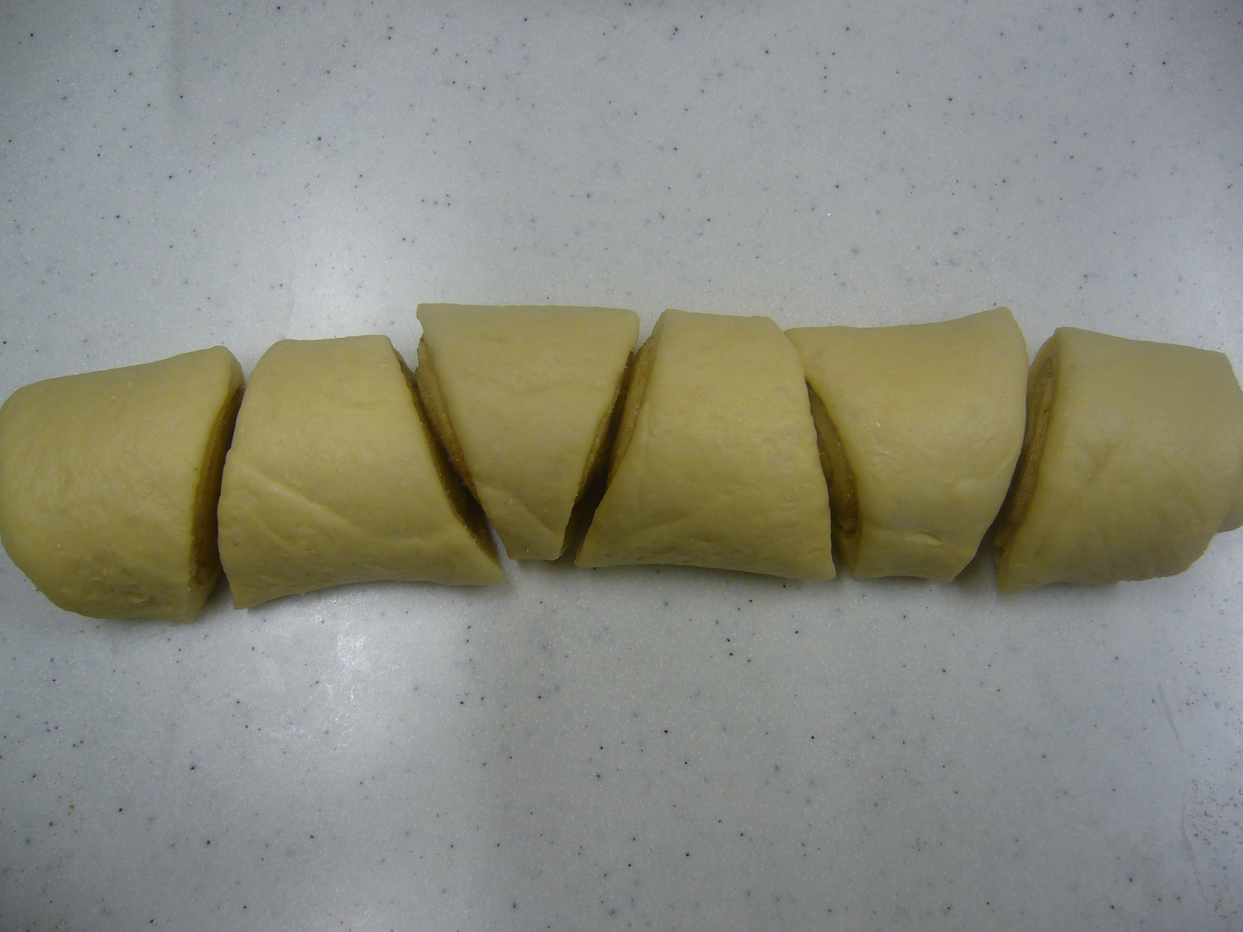 手前からくるくると巻いて、巻き終わりをしっかり閉じて、少し台形の形にしながら6等分にカットする。