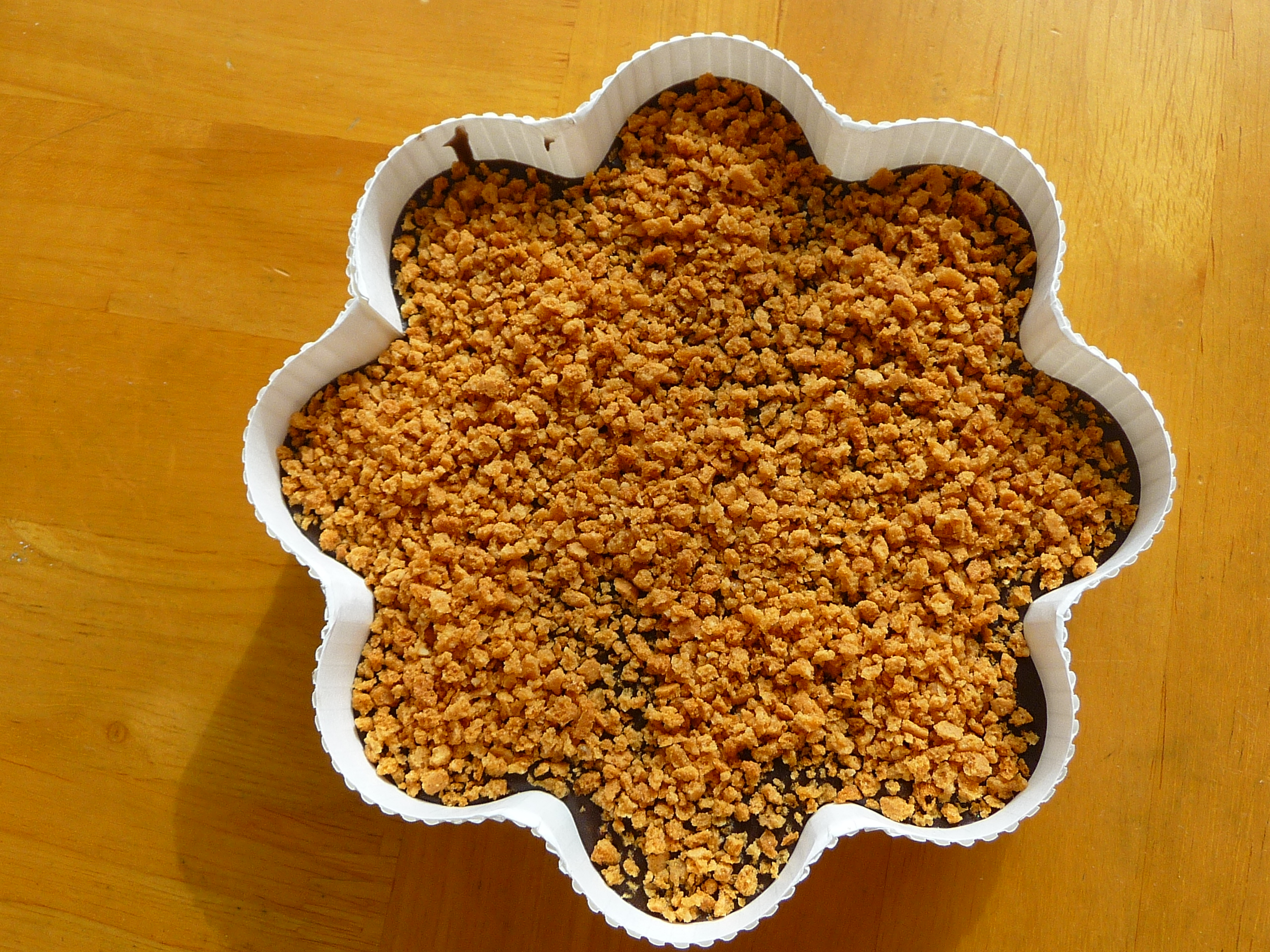 焼き型に生地を流し入れ、表面にアーモンドクランチをのせる。