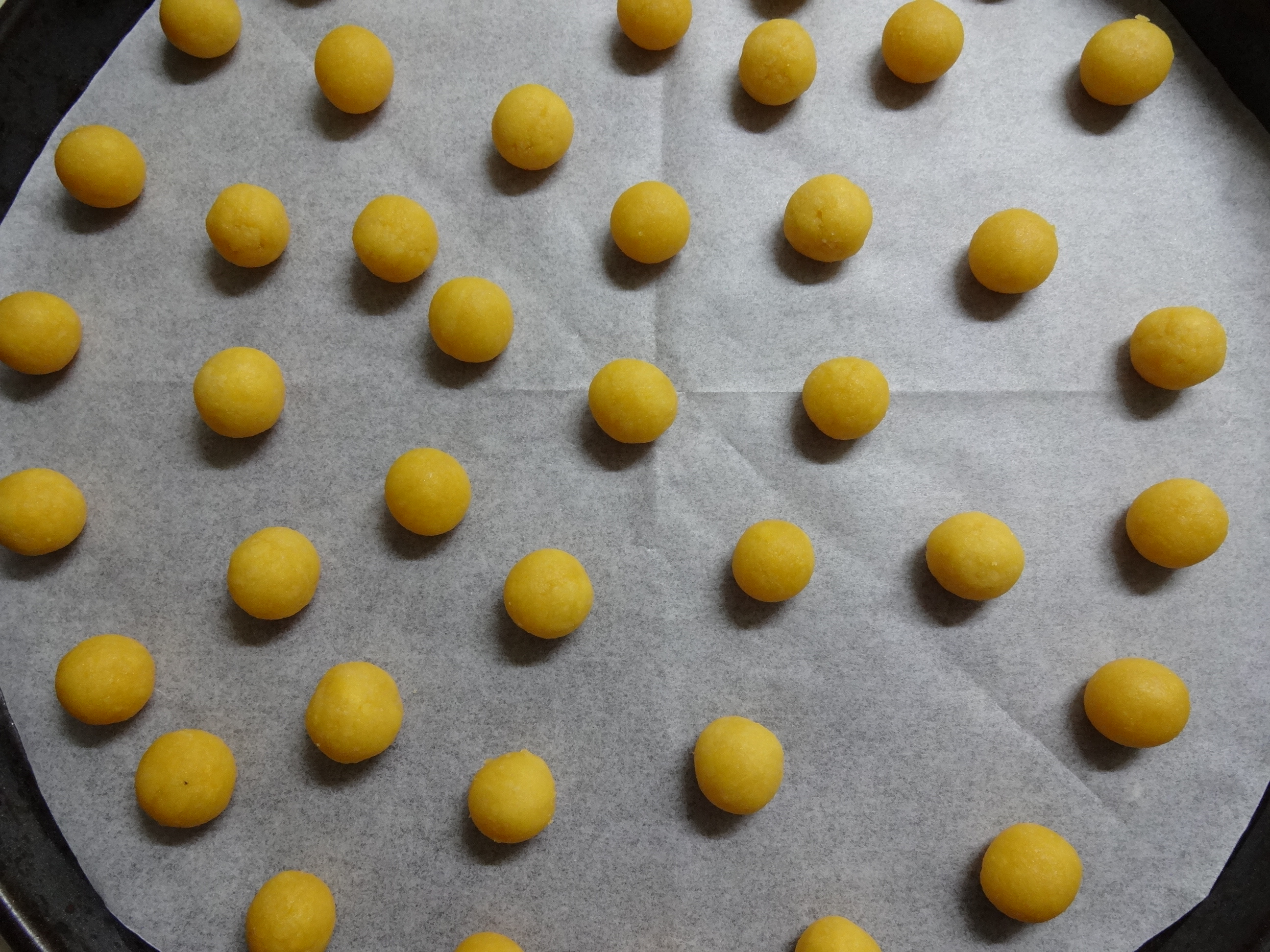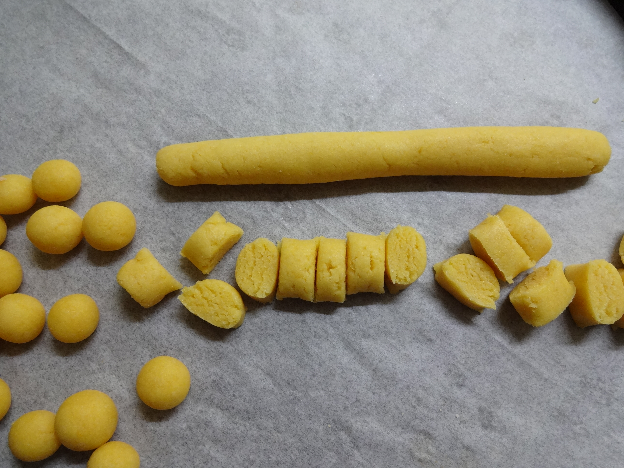 1本を15ケにカットし、手のひらでボール状に丸める。