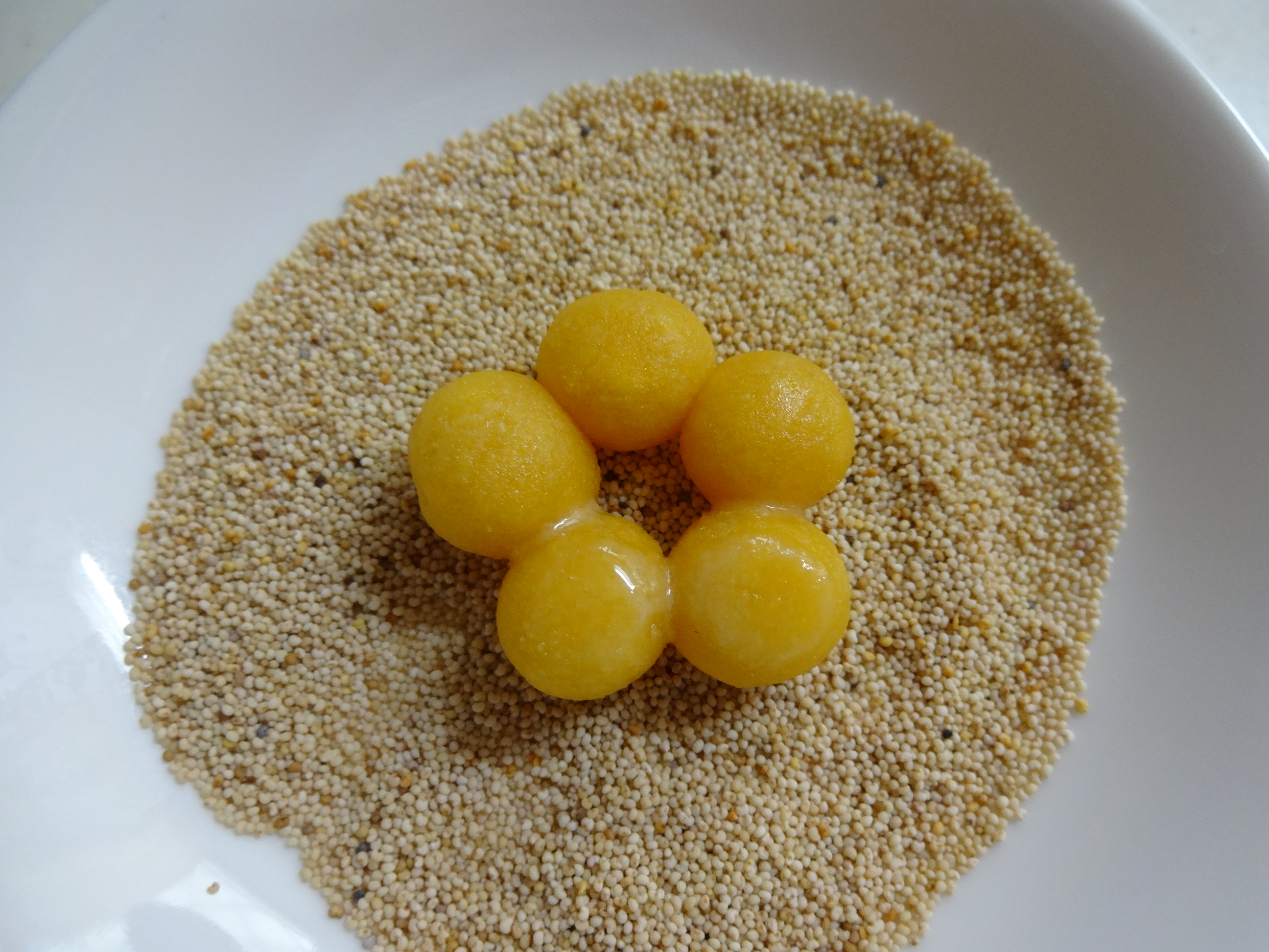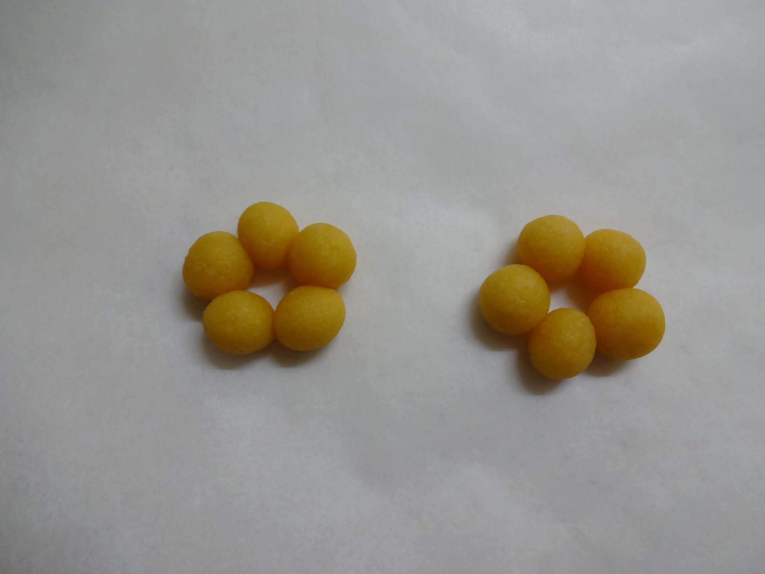 ①~③まで同様に作り、大豆ボーロより小さめに生地を丸め、5ケ1組で輪になるようにくっつけ、お花の形にする。