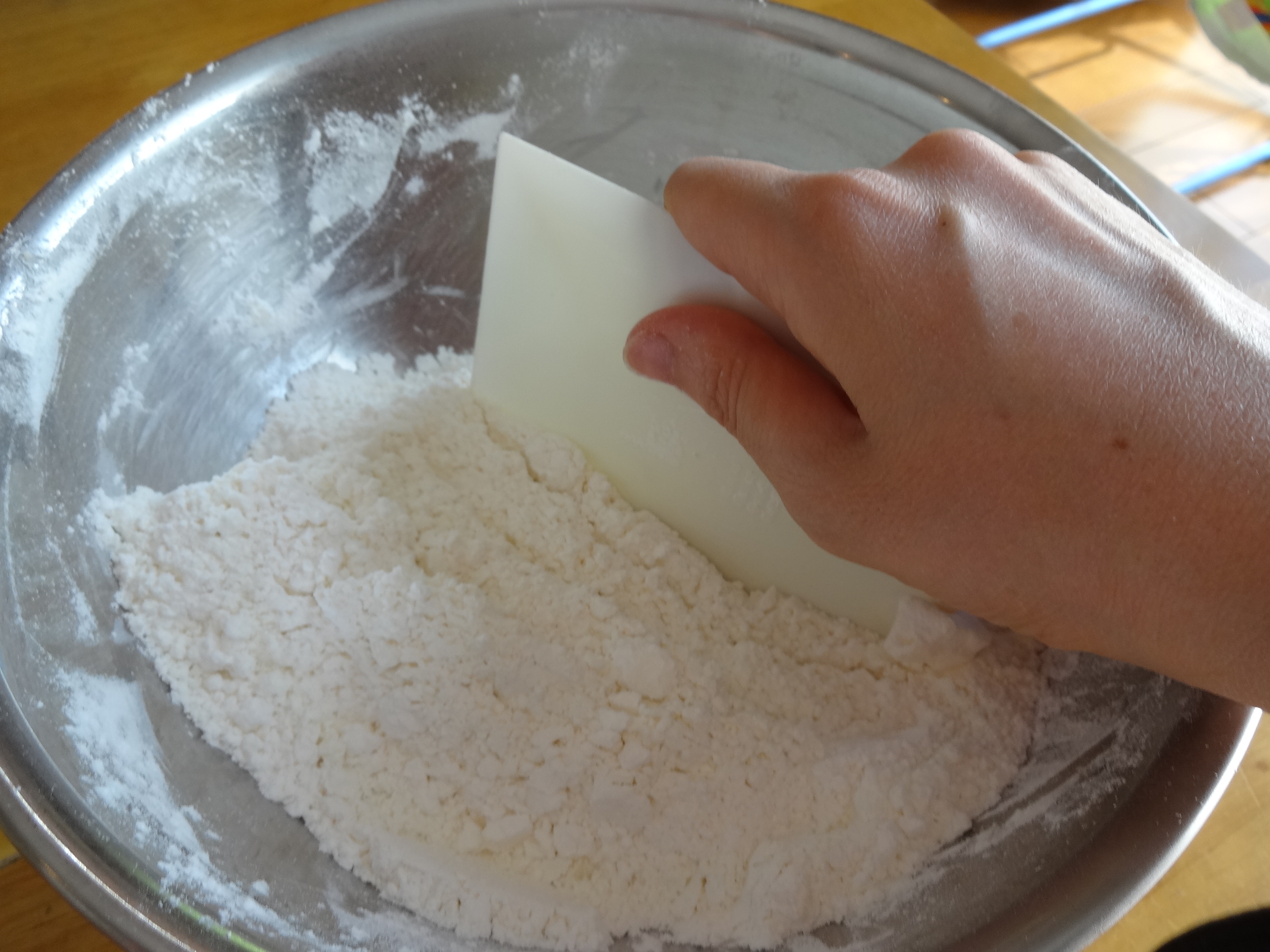 冷やしておいた粉にバターを入れ、カードでバターを細かく刻むようにする。