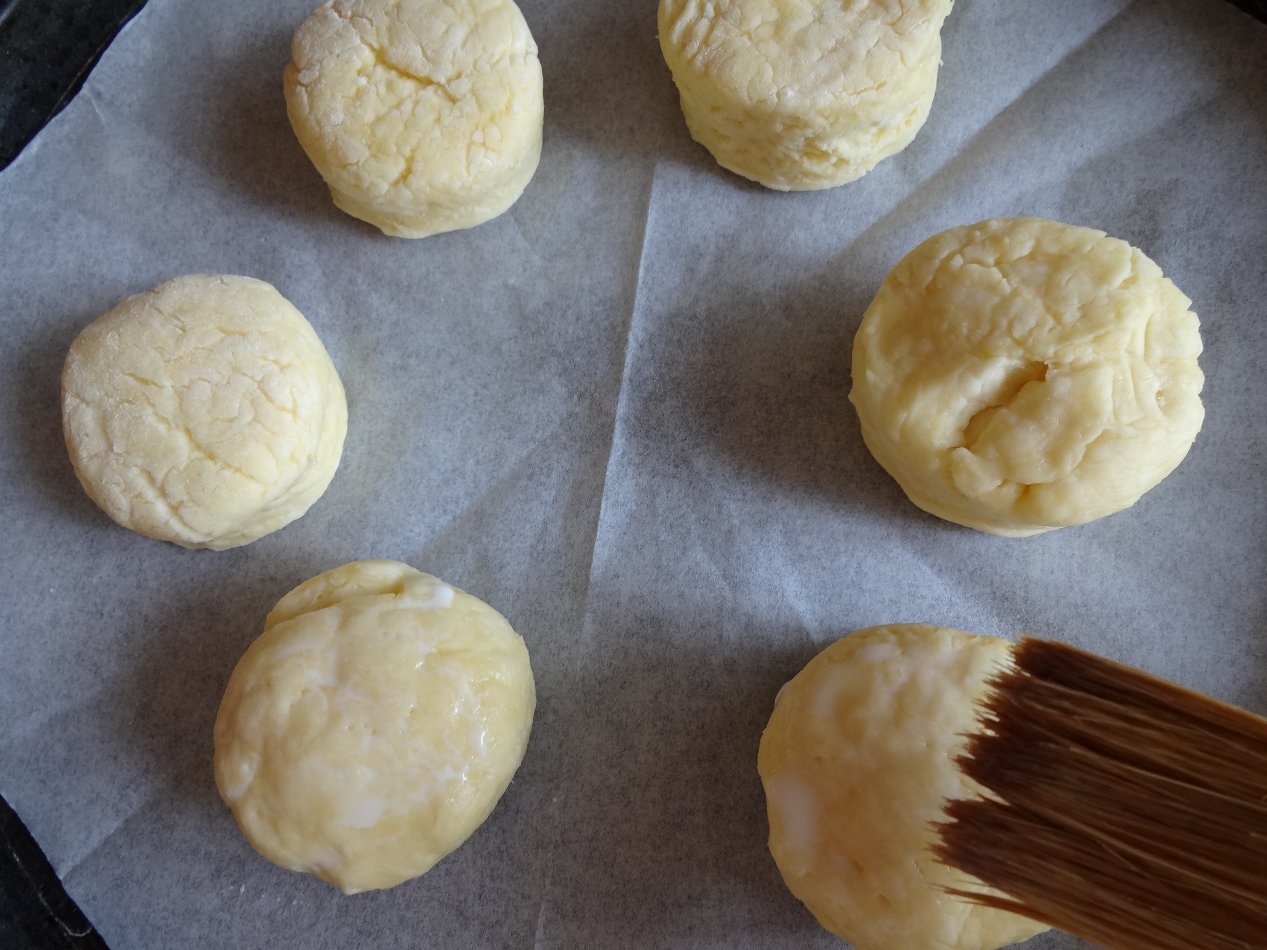 オーブンペーパーを敷いた天板に並べ、照り出しに刷毛で牛乳を薄く塗る。
