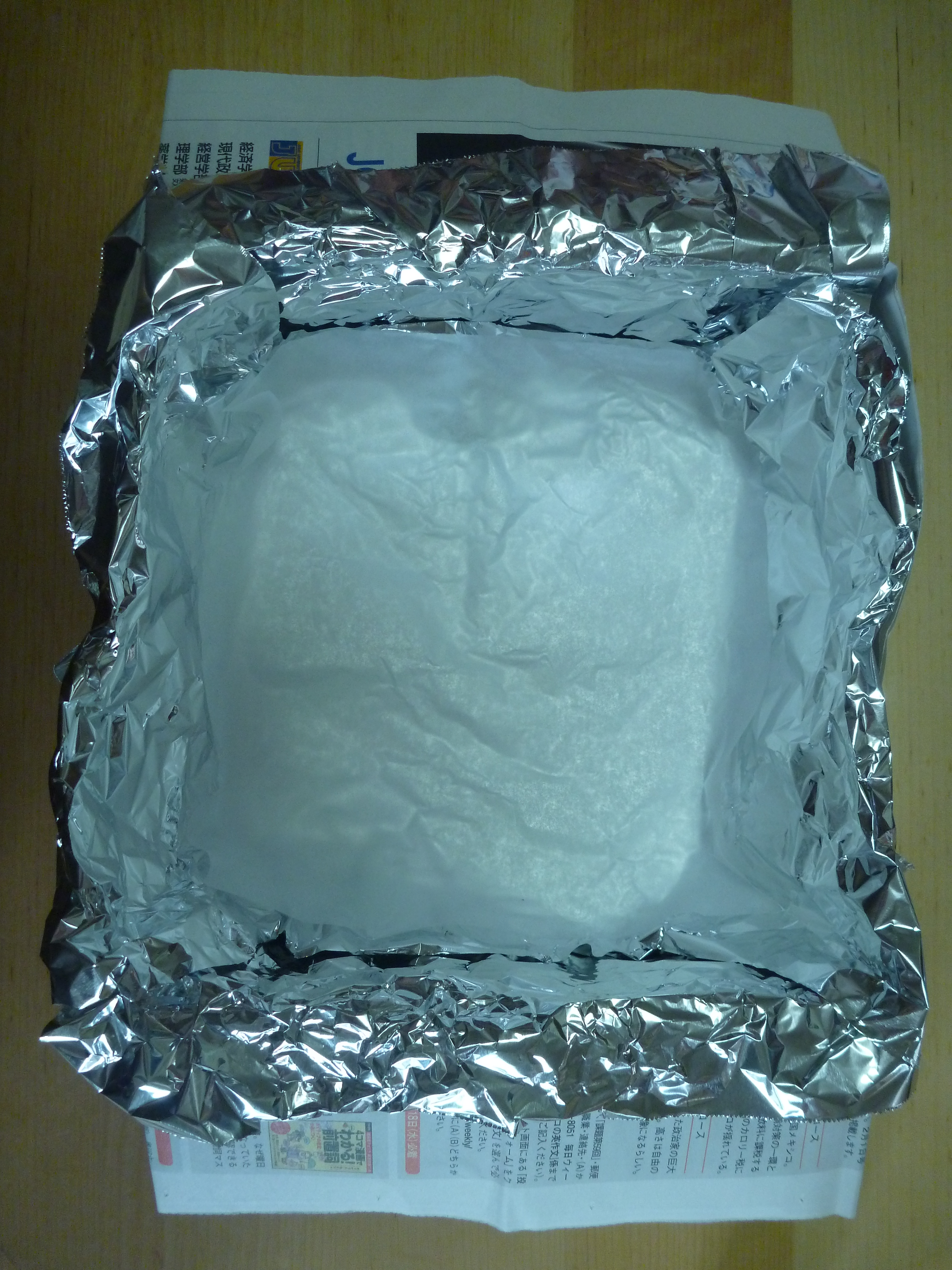 新聞紙を6枚程重ね型を作り、その上に十字に重なるようにアルミホイルをかぶせ、底には22cm×22cmのオーブンペーパーを敷く。