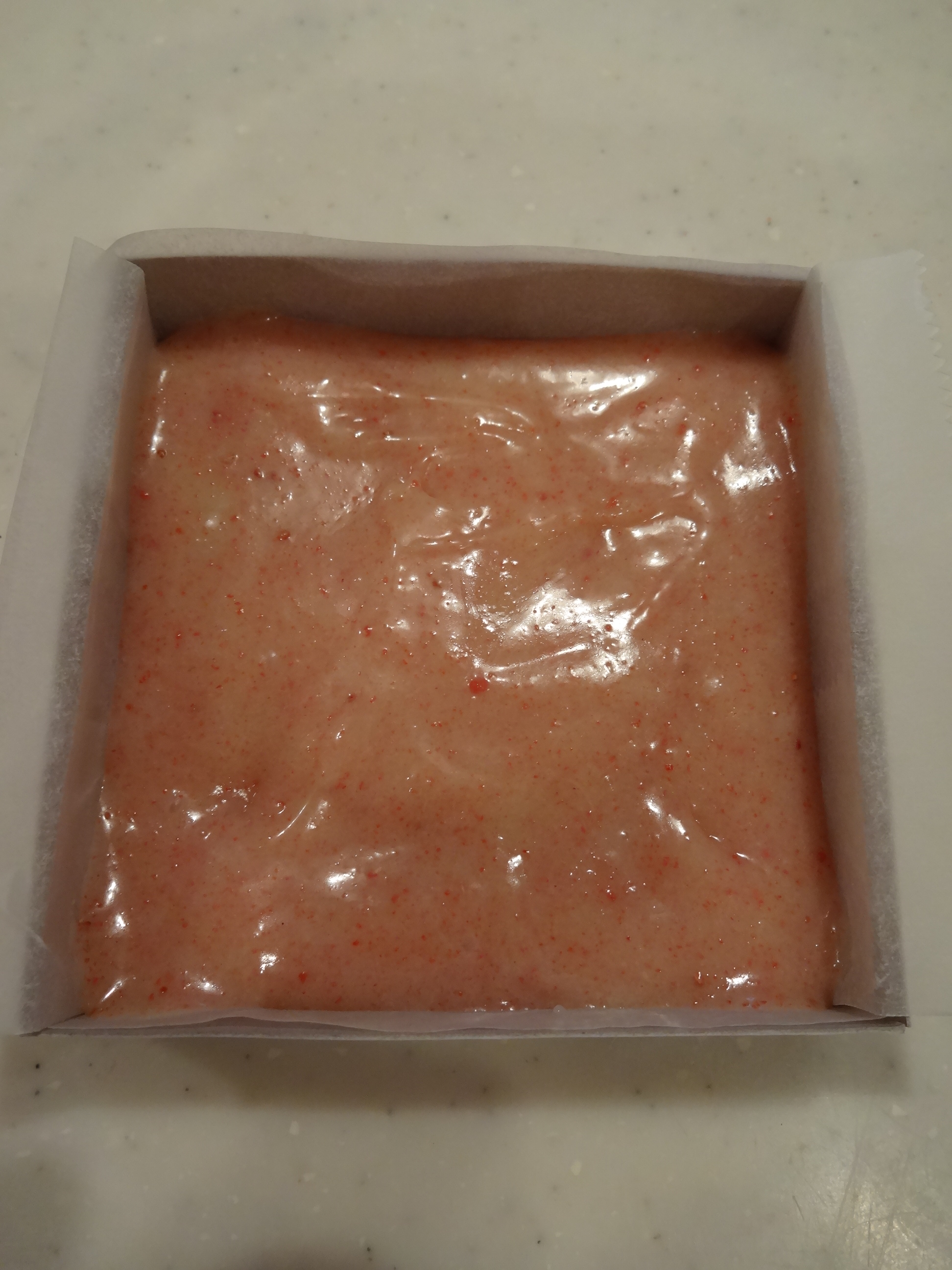 ③を小さじ1杯分程残し、オーブンペーパーを敷いた型に静かに流し、表面を平らにする。