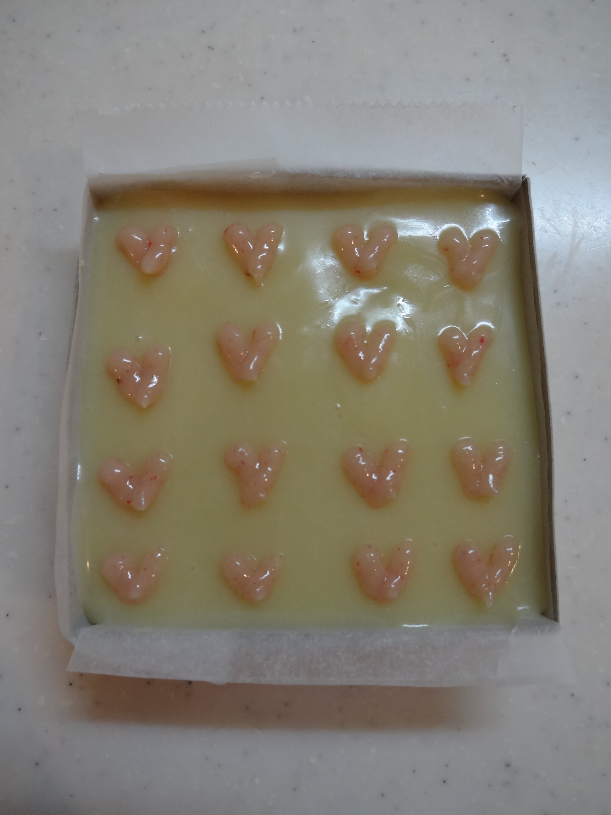 残しておいたイチゴチョコをコルネに入れ、表面にハート(V字)に絞る。