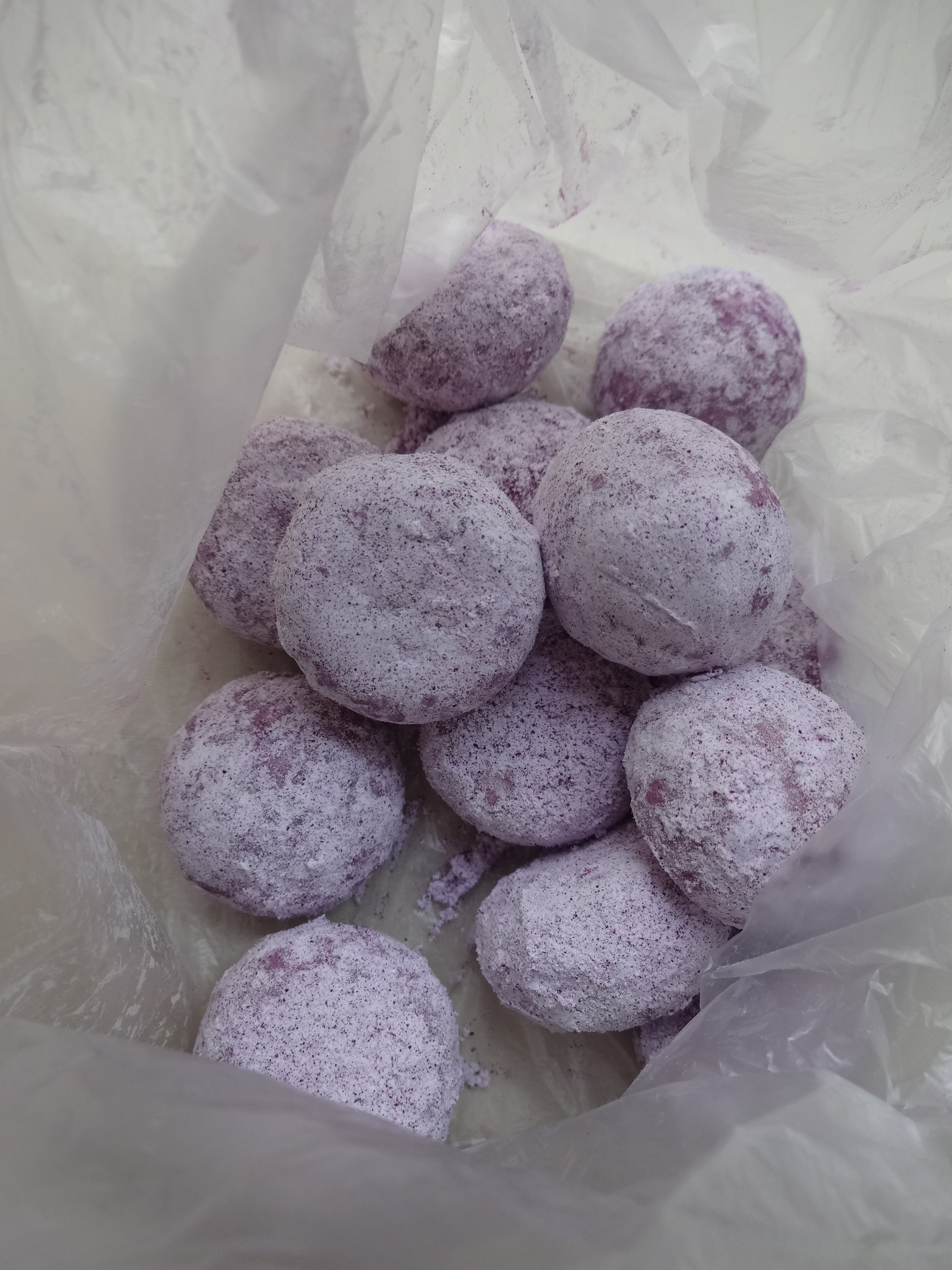 ビニール袋等に仕上げ用のシュガーパウダーと紫芋パウダーを入れその中にクッキーを入れてまぶす。