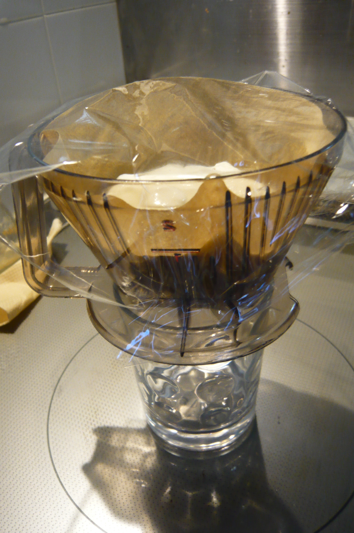 ヨーグルト450gをコーヒーフィルターに入れ、一晩水を切る。