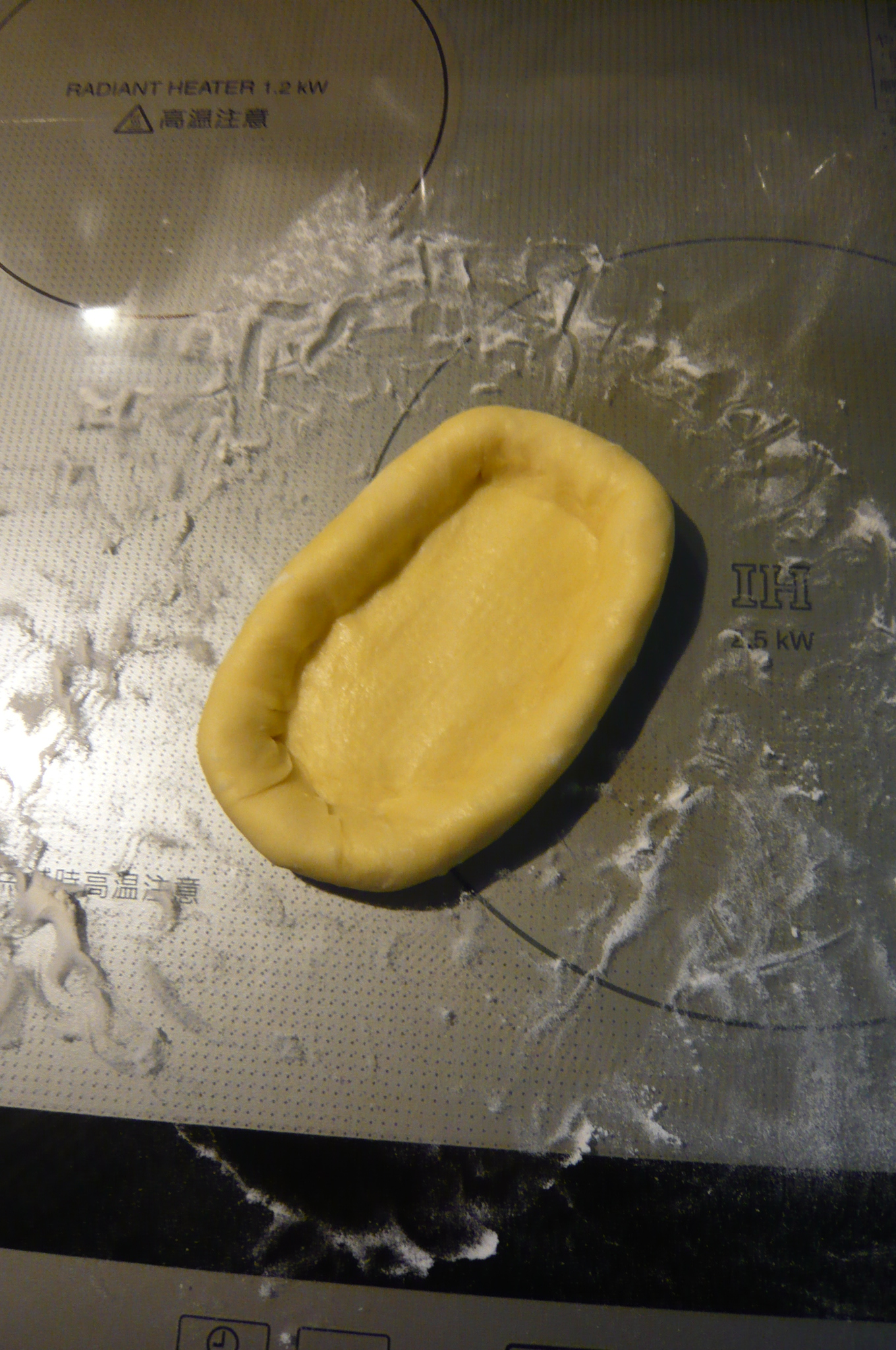 手粉をし、とじ目を上にして20cmくらいの楕円形に伸ばす。周りを1周折り、さらにもう一度折る。