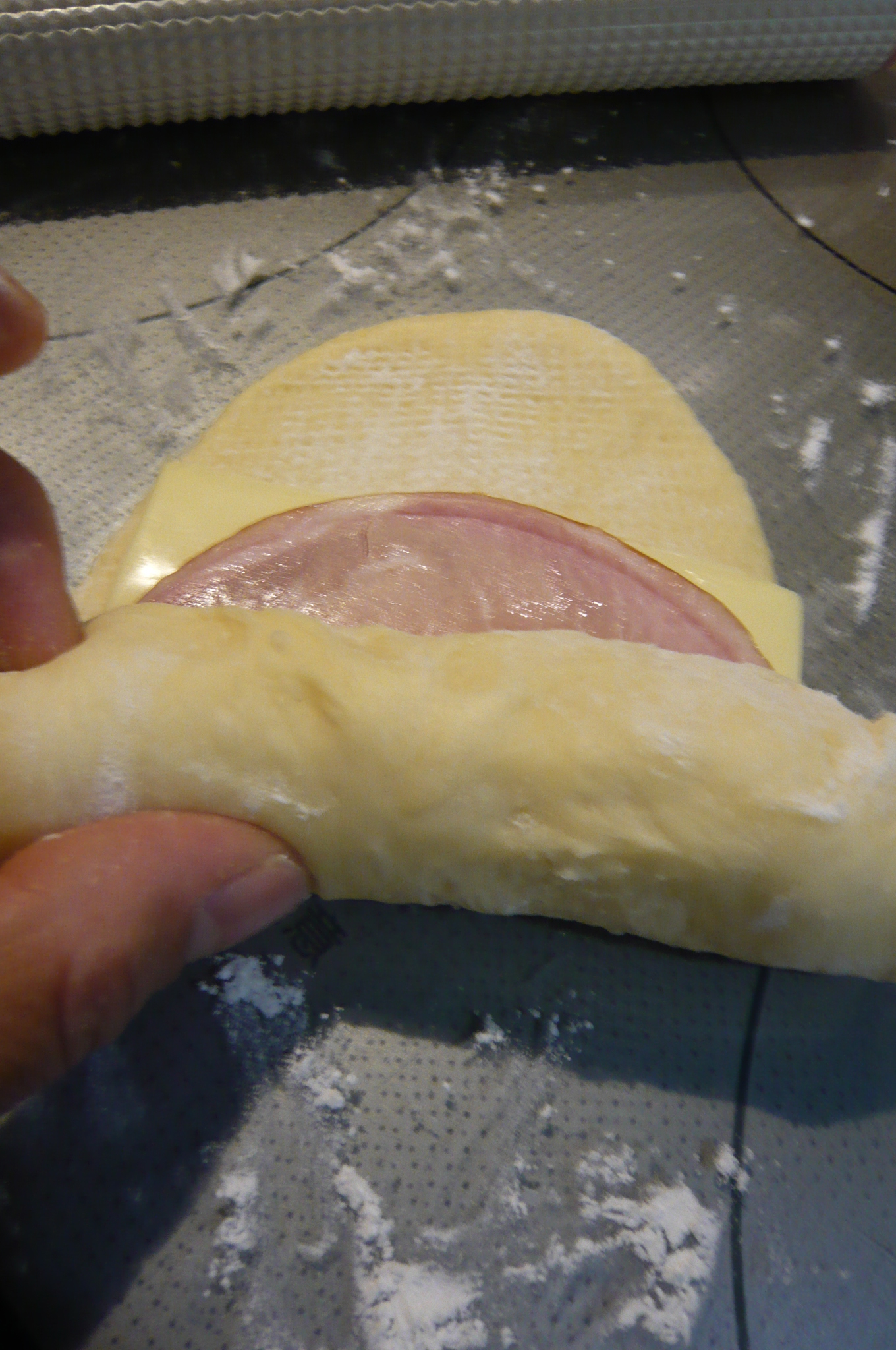 手粉をし、再度ガスを抜き、15センチほどにのばす。 チーズ&ハムを生地にのせ、くるくると巻く。端はチーズがなるべく出ないようにとじて上から生地を押し、平らにする。