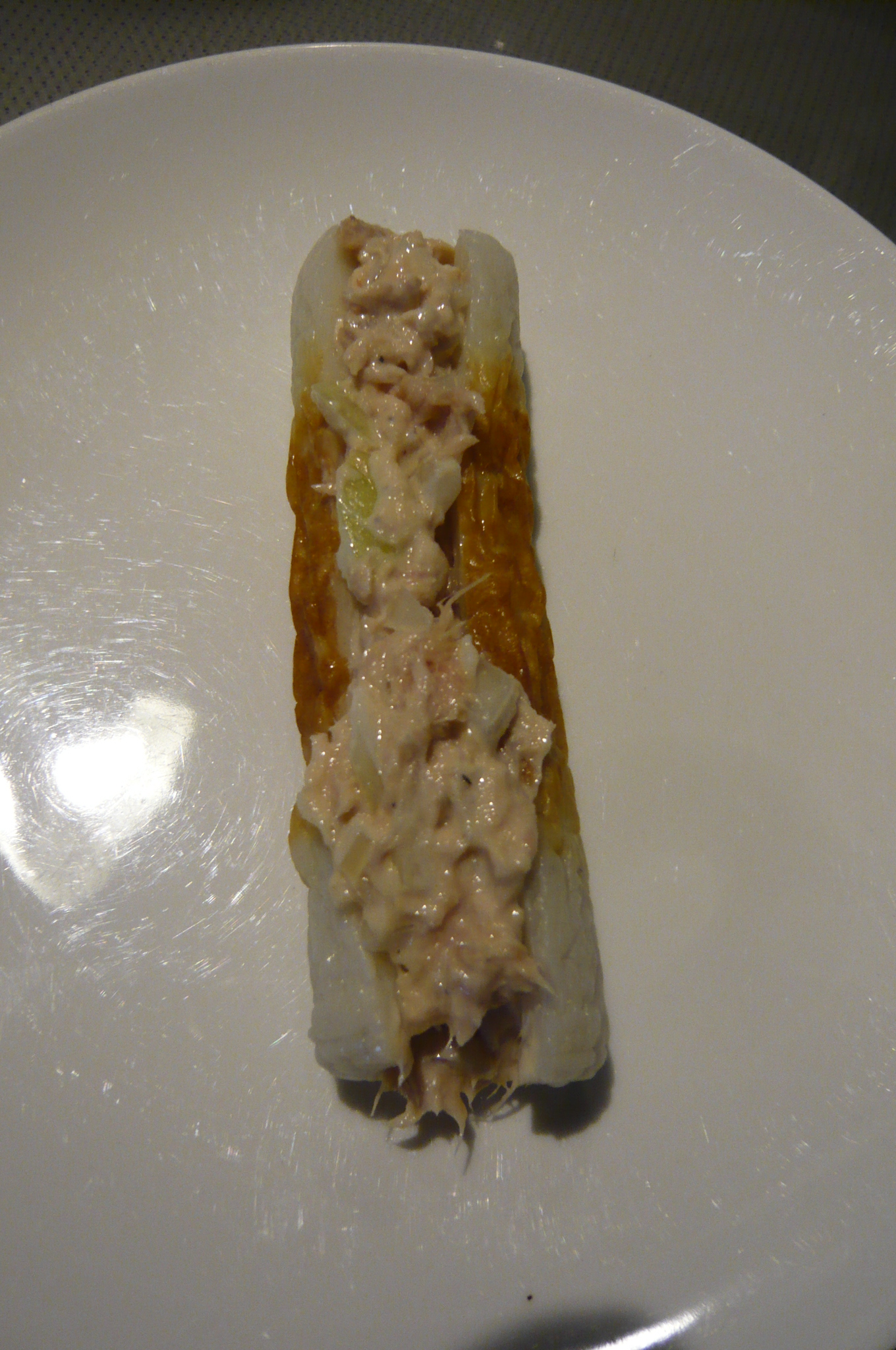 たまねぎをみじん切りにする。油をきったツナとマヨネーズ、黒コショーと合わせる。