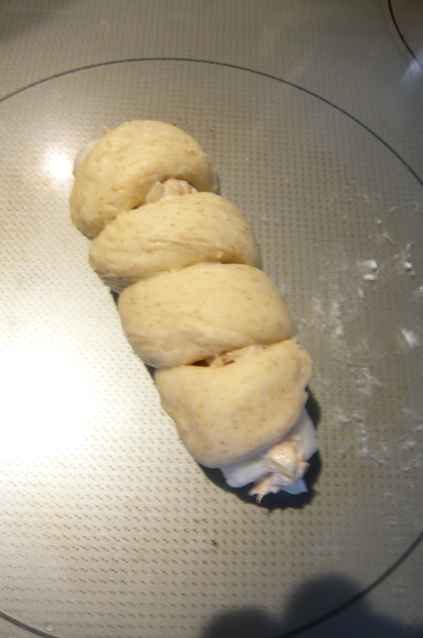オーブン220度で予熱。ドリュール(卵と水を混ぜたもの)を塗り、マヨネーズを絞る。190度に下げ、15分ほど焼く。
