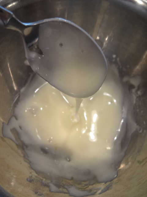 ボウルにシュガーパウダーを入れジュースを小さじ1加えて混ぜる。スプーンですくってたら~っと垂れるくらいの固さになるように残りのジュース小さじ1は様子を見ながら少しずつ加える。