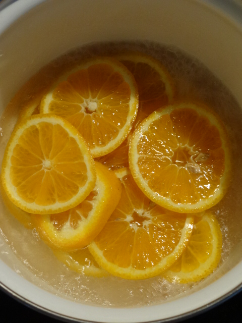 鍋にオレンジを入れ、被るくらいの水を入れる。火にかけ沸騰したらざるにとり、やわらかいたわしで皮をよくこすり洗う。