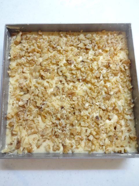 刻んだくるみを全面に散らし、アーモンドクリームに押し込むように軽く上から手で押す。