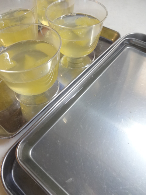 はちみつ漬のレモンを小さくカットし、カップに入れる。カップの7分目までゼリー液を注ぐ。残りのゼリー液(全体の1/4量ほど)は浅いバットなどに流す。