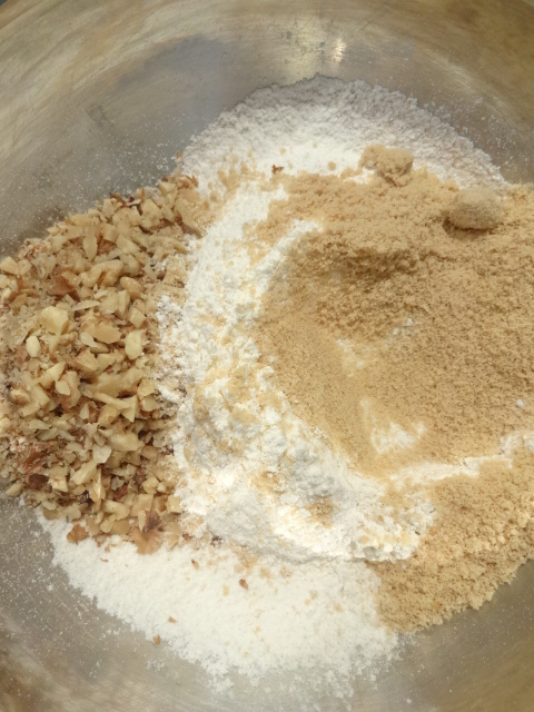 ボウルにふるった粉類、メープルシュガーとグラニュー糖、クルミを入れ全体を軽く混ぜる。