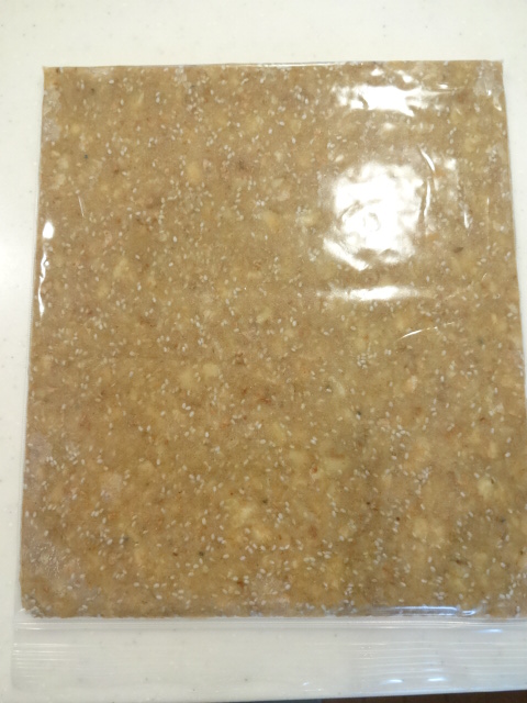 ビニール袋またはジッパー付き袋へ生地を入れ、めん棒で押し固めるように10×18cm、7~8mm厚さにのばす。