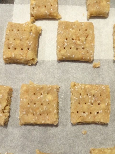 表面にフォークで穴をあけ、オーブンペーパーを敷いた天板に並べる。