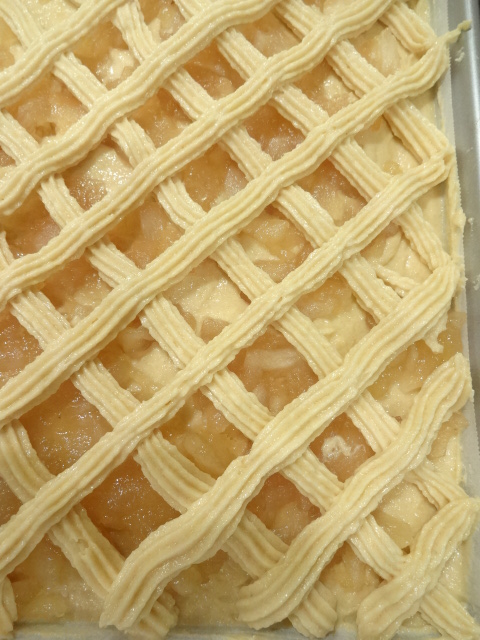残りの生地を星口金をつけた絞り袋に入れ、⑥の表面に格子状に絞る。隣同士の線を少し離す。