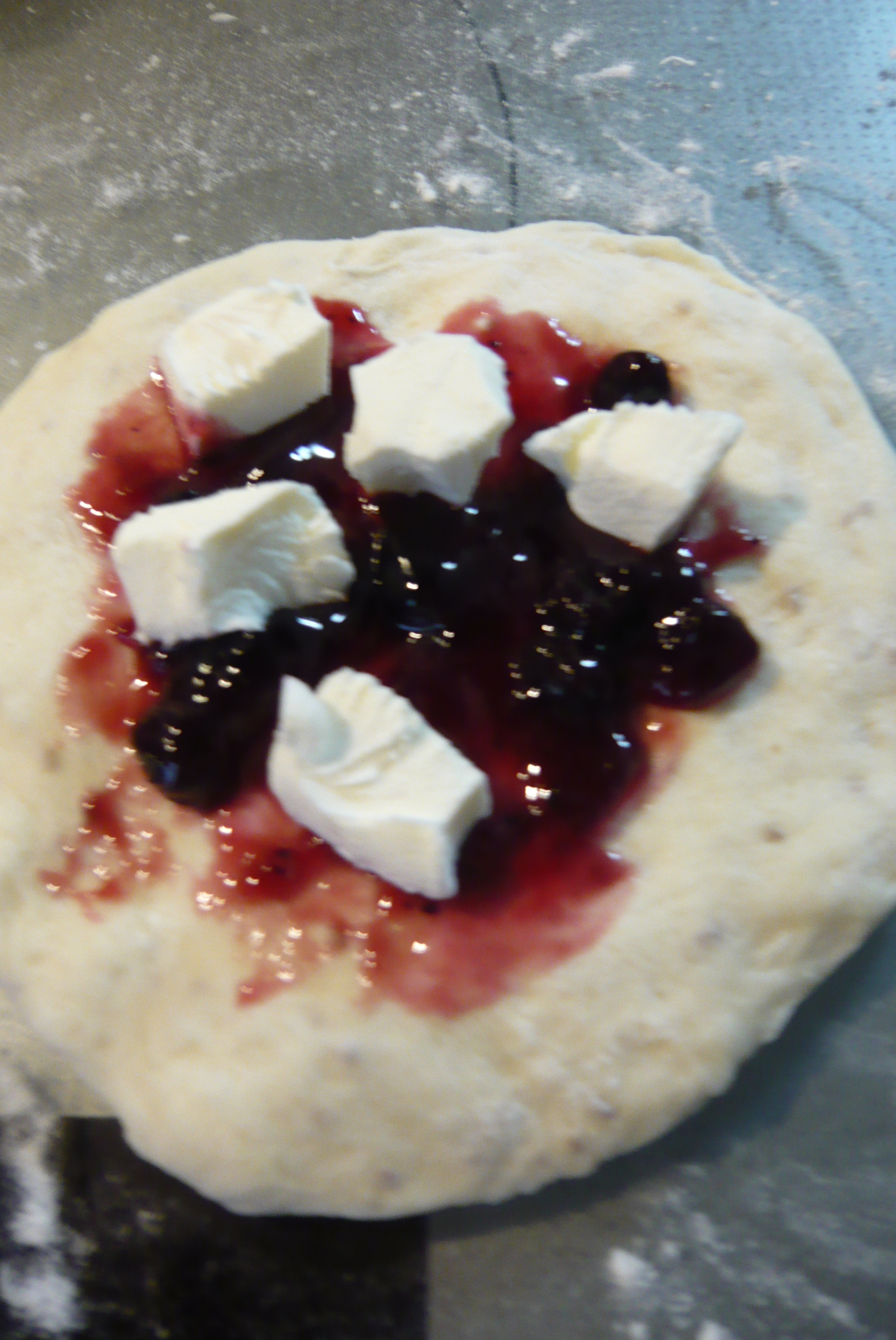 手粉をし、11cmくらいの円に伸ばす。真ん中にブルーベリージャムを塗り、1cm角のクリームチーズを、散らす。