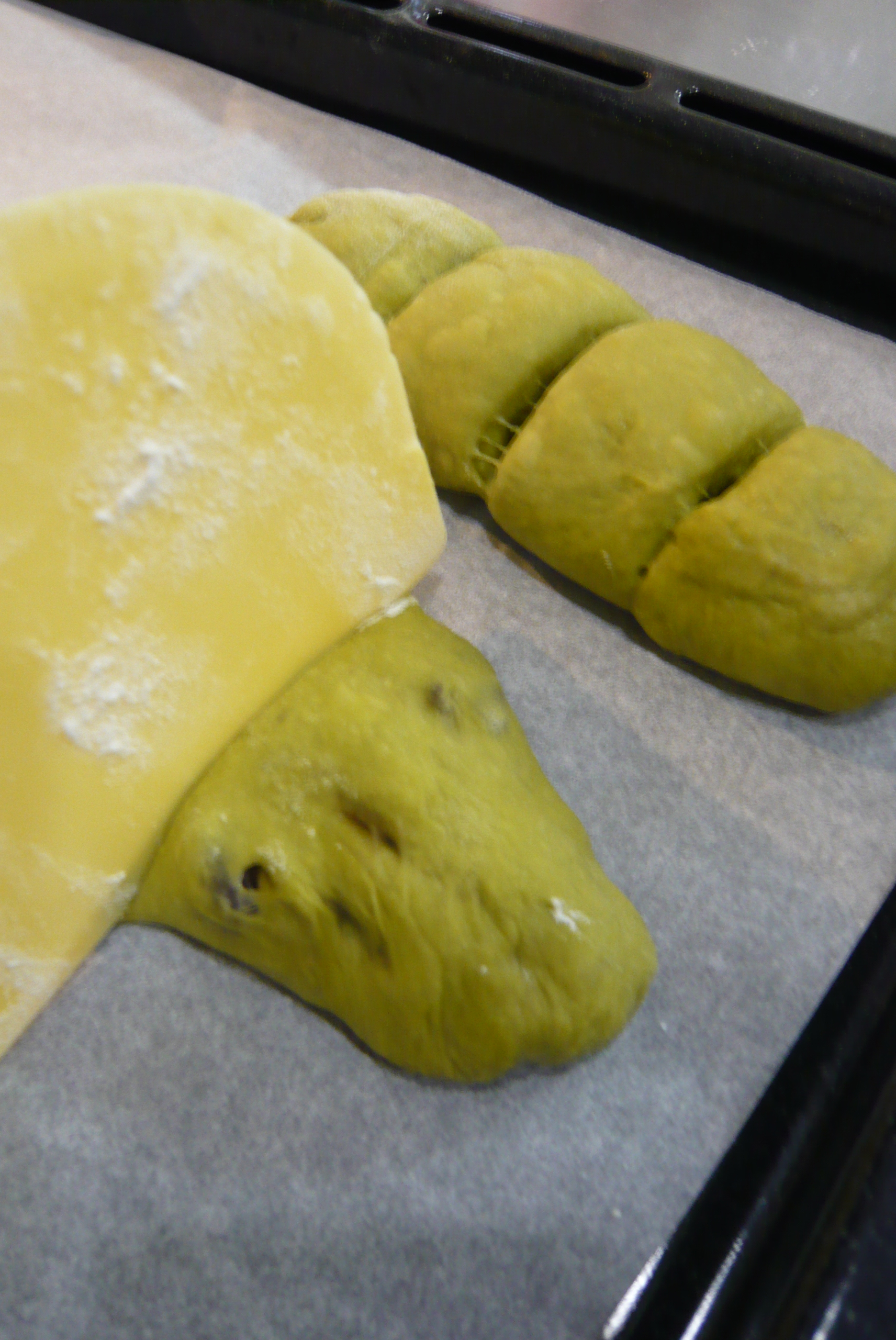 オーブンペーパーを敷いた天板に並べ、スケッパーで三本切込みを入れる。全体をビニール袋で覆い二次発酵60分。