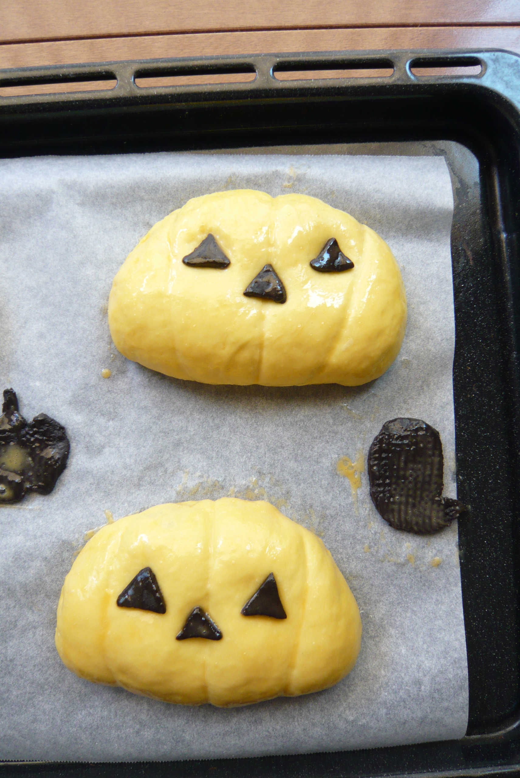 ココアクッキーの半量を5mmほどに伸ばし、かぼちゃの目と鼻の部分を合計24個切り取り、顔に付ける。 残りのクッキーはお好きな型などで抜いて一緒に焼いてください。