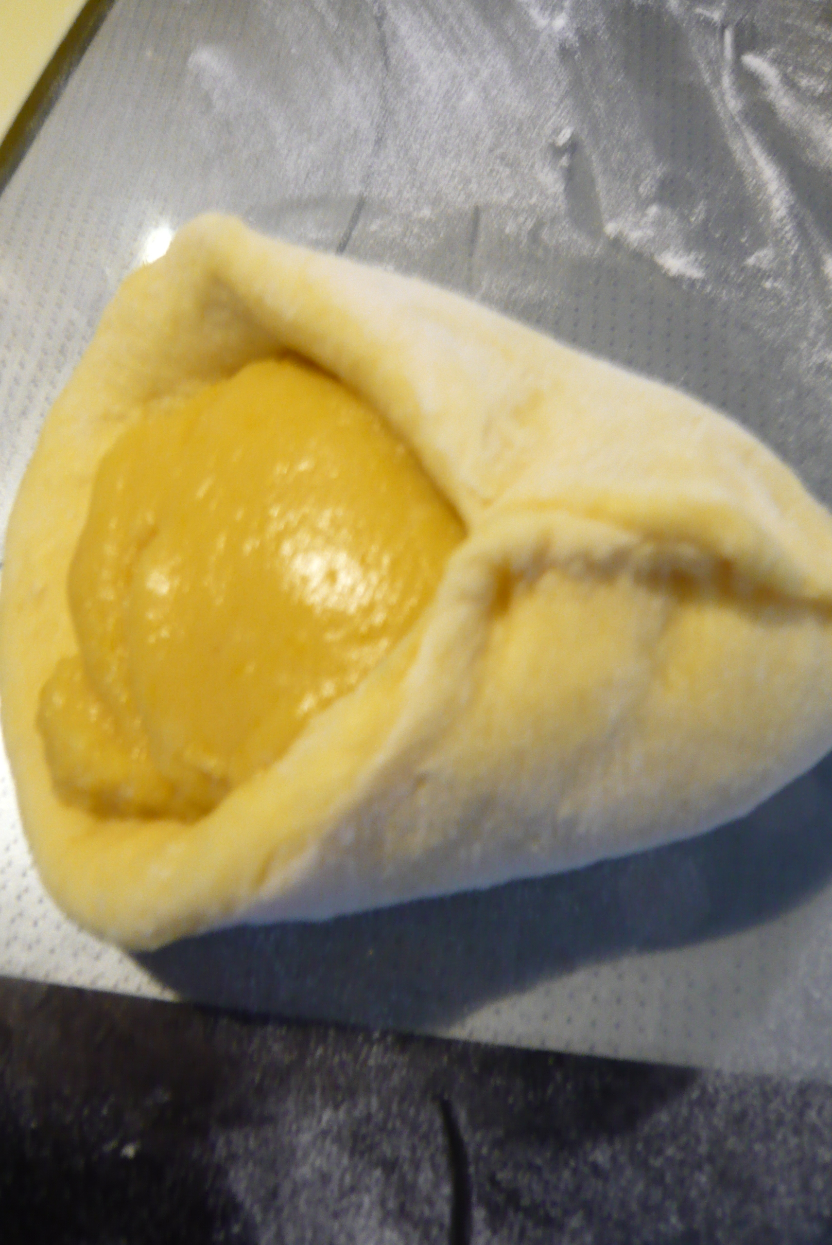 打ち粉をし、麺棒で直径10cm位に広げ、クリームの1/8量ずつをのせ、端と端を合わせてしっかりとめる。