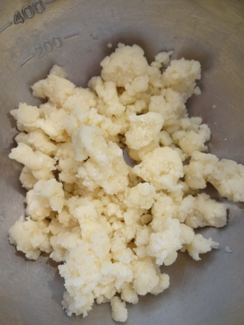 (クランブルを作る)合わせておいたクランブル用の粉類にバターを加え、バターを指で押しつぶすように粉類となじませて、そぼろ状になったら使うまで冷蔵庫で休ませる。