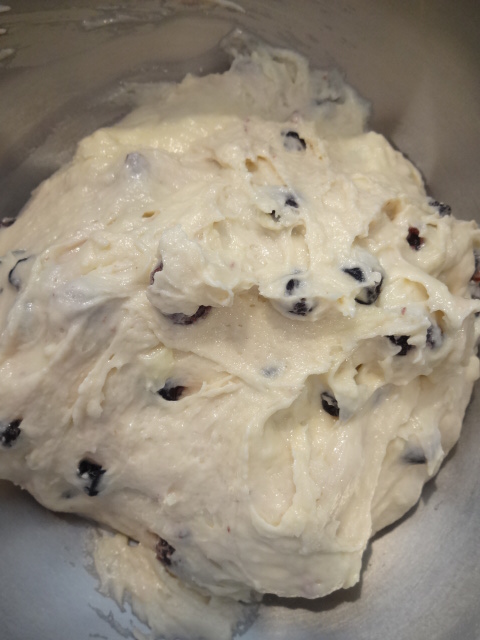 刻んでおいたチョコとミックスベリーを加え、ゴムベらで混ぜ合わせる。