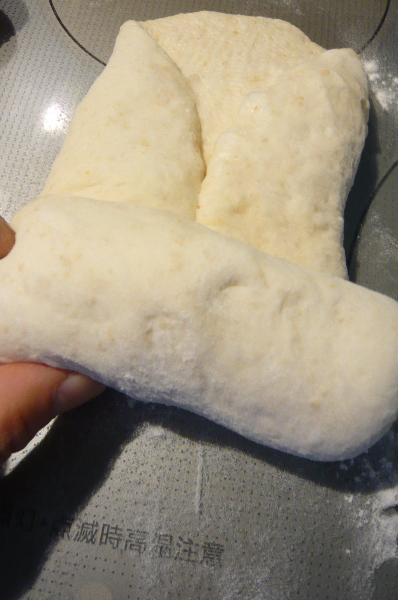 手粉をし、再度ガスを抜き、15×25ほどに伸ばし、長いほうをたてにして、両端をまん中に折り、下からくるくると巻く。とじ目はしっかりとじる。 もう一方のの生地も同じように巻く。