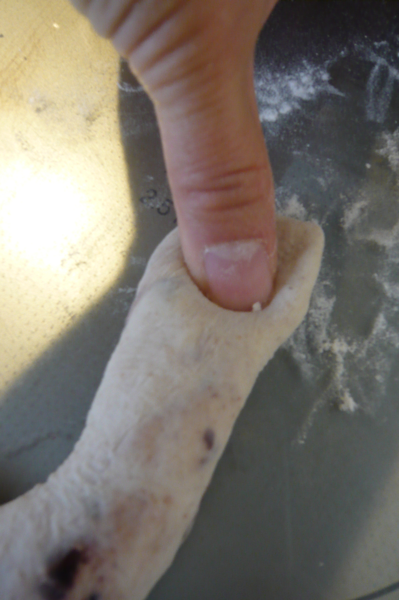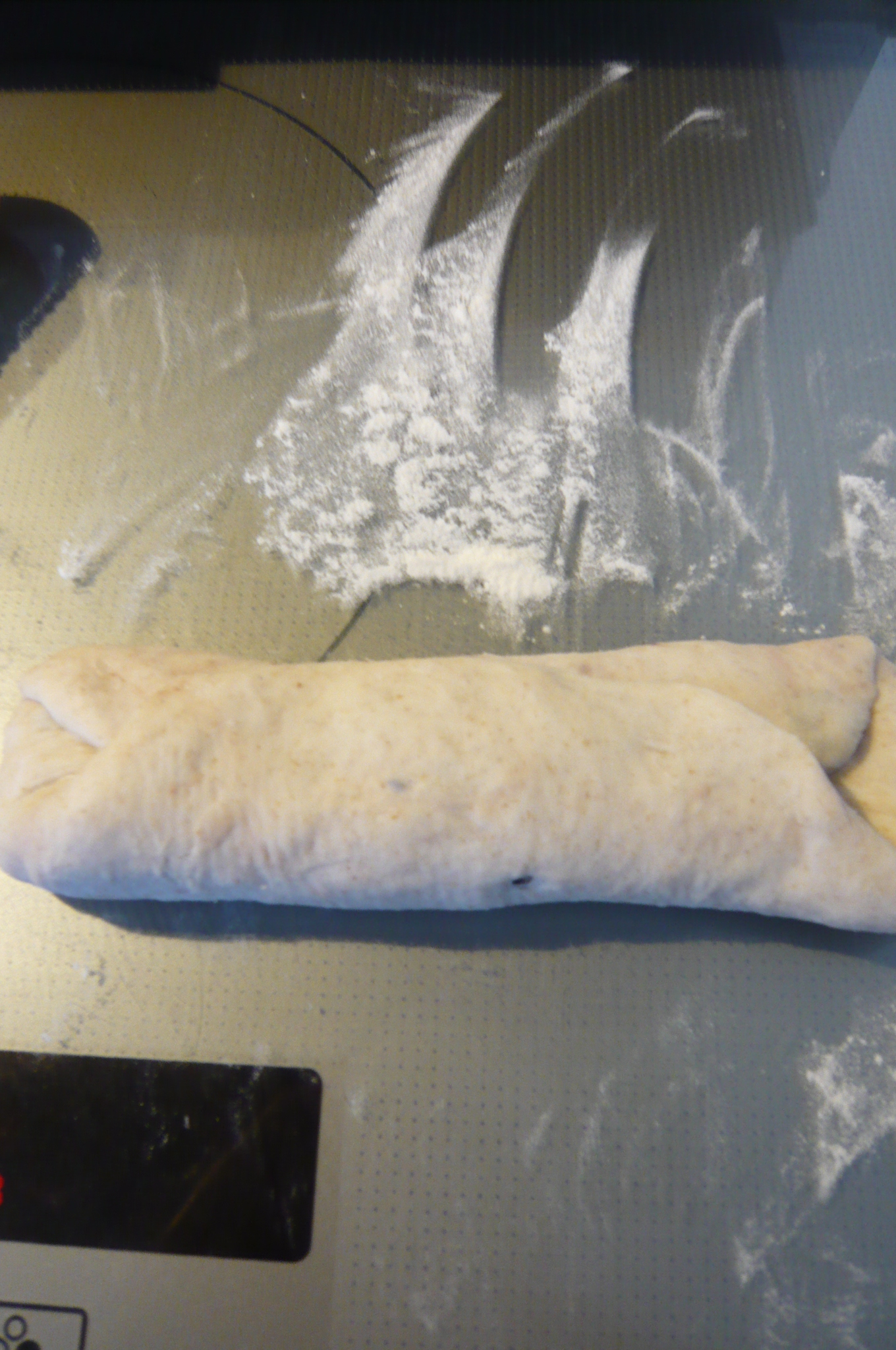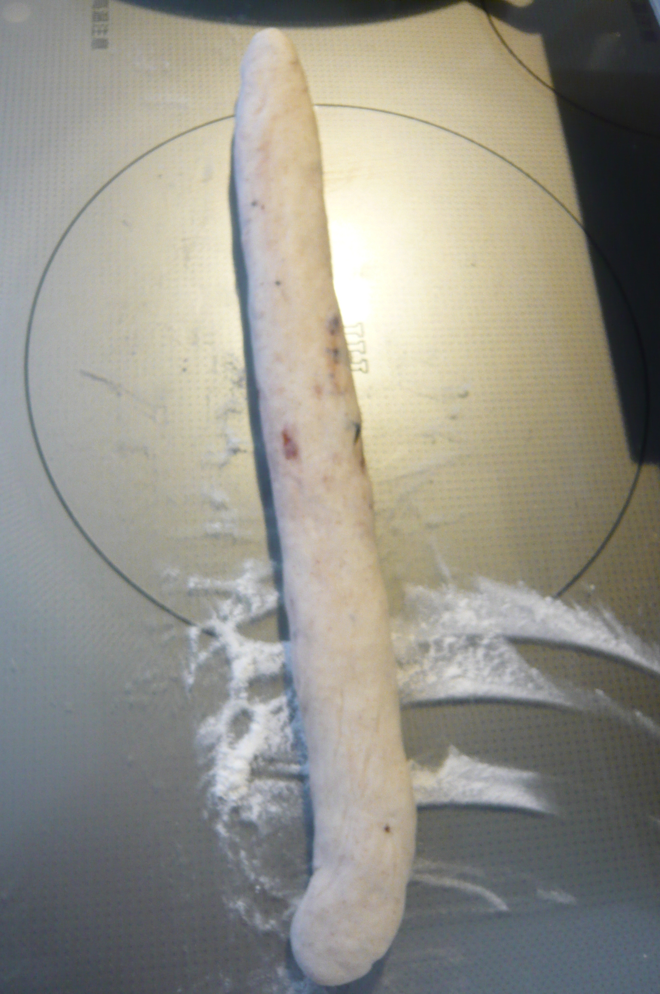 成形する。麺棒で伸ばし、三つ折にし、転がして、棒状にする。なるべくベリーが生地から出ないように。