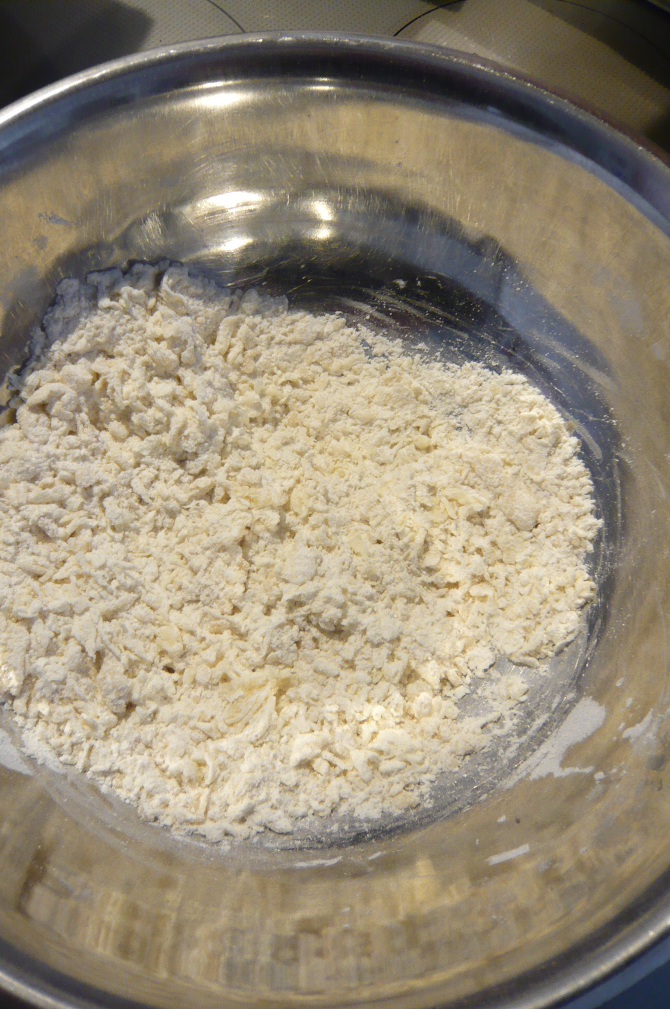 ボウルに、Bの薄力粉とベーキングパウダーを振るい入れ、砂糖、塩を混ぜ合わせる。ぬるま湯の半量を入れ、全体的に湿らせる。