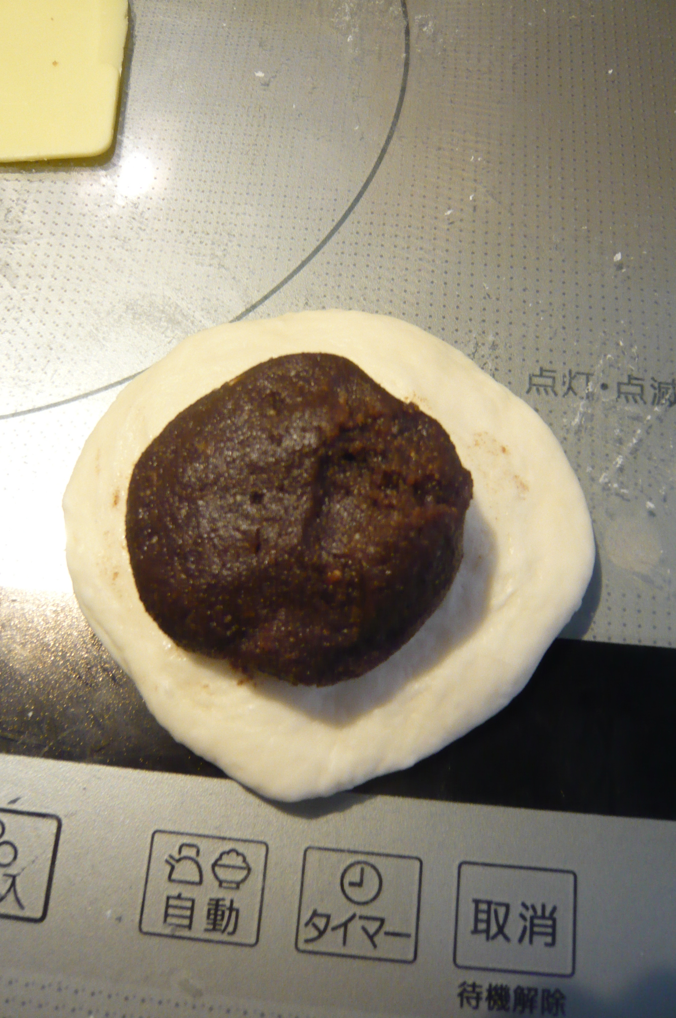 直径10cmほどに伸ばし、あずき餡をのせ包む。