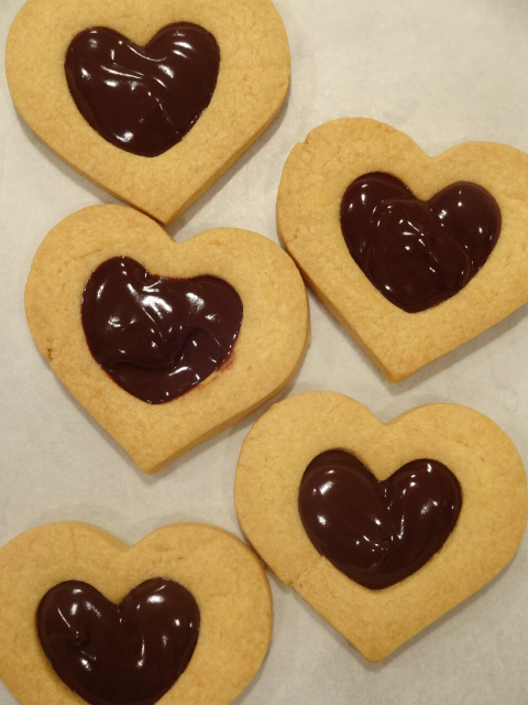 ワックスペーパーなどの上にクッキーを並べ、ガナッシュを真ん中のハートのくりぬき部分に流しこむ。