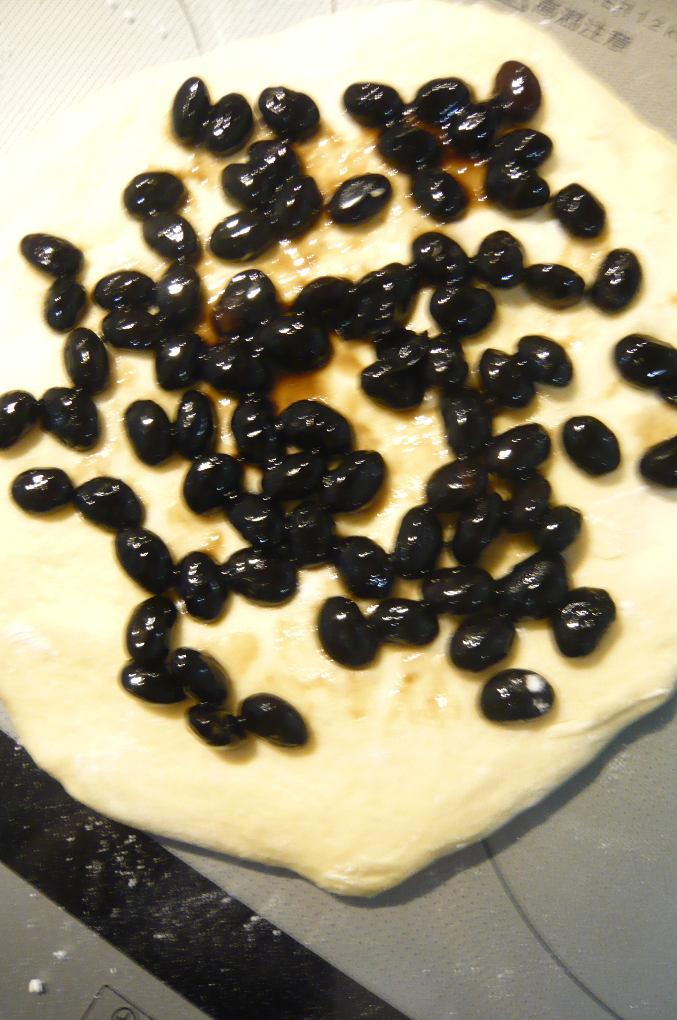 生地の厚さ1.5cmほどに伸ばし、汁気を切った黒豆を全体にのせる。