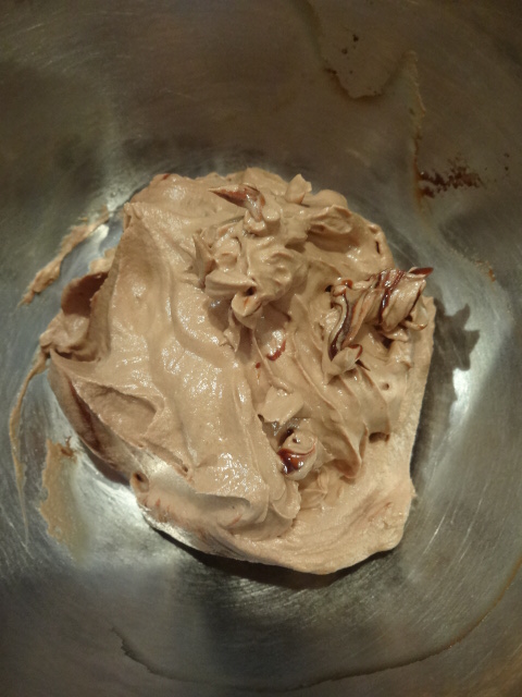 ガナッシュクリームをつくる。チョコレートを湯せんで溶かし、牛乳を加えてよく混ぜてガナッシュを作る。別のボウルで生クリームを7分立て(軽く角が立つ)に泡立て、ガナッシュを加え混ぜる。※チョコをいれたら混ぜすぎない!