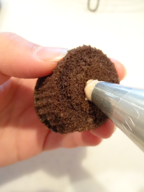 細口金をつけた絞り袋にクリームを入れる。ケーキの紙を剥がし、底の部分にクリームの口金を押し込むようにして刺して中にクリームを注入する。