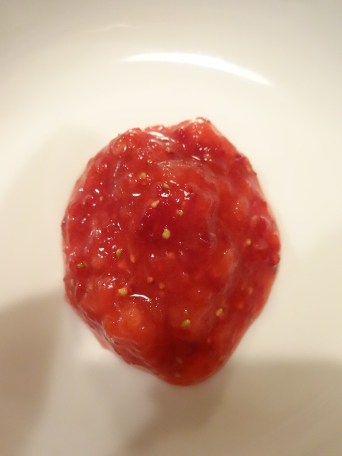 ☆いちごを細かくつぶす。または包丁でたたいて細かくピューレ状にする