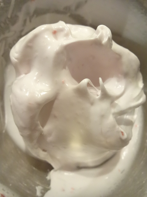 ピンとしっかりした角が立つまで泡立て、いちごピューレを加える。