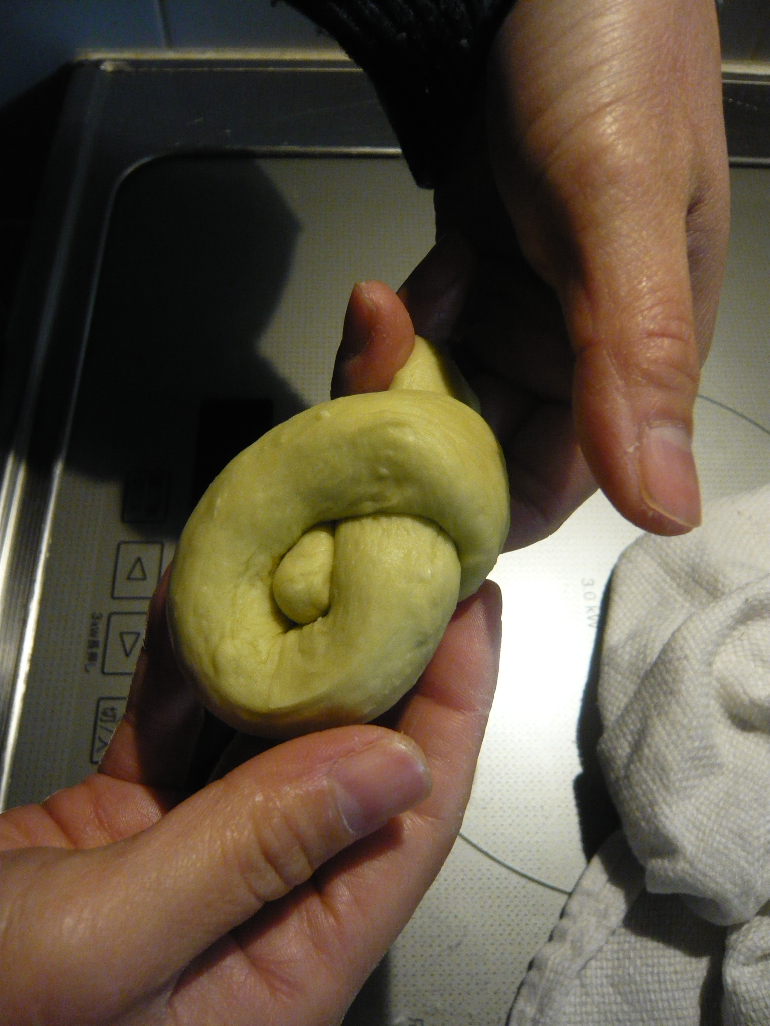 生地を丸めなおし、平らにして両端を折り、端を合わせて継ぎ目を閉じる。生地を20cmほどの棒状にし、結んで成形する