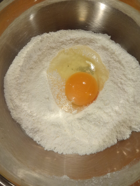 ボウルにふるった粉を入れ、中央に卵を割り入れる。