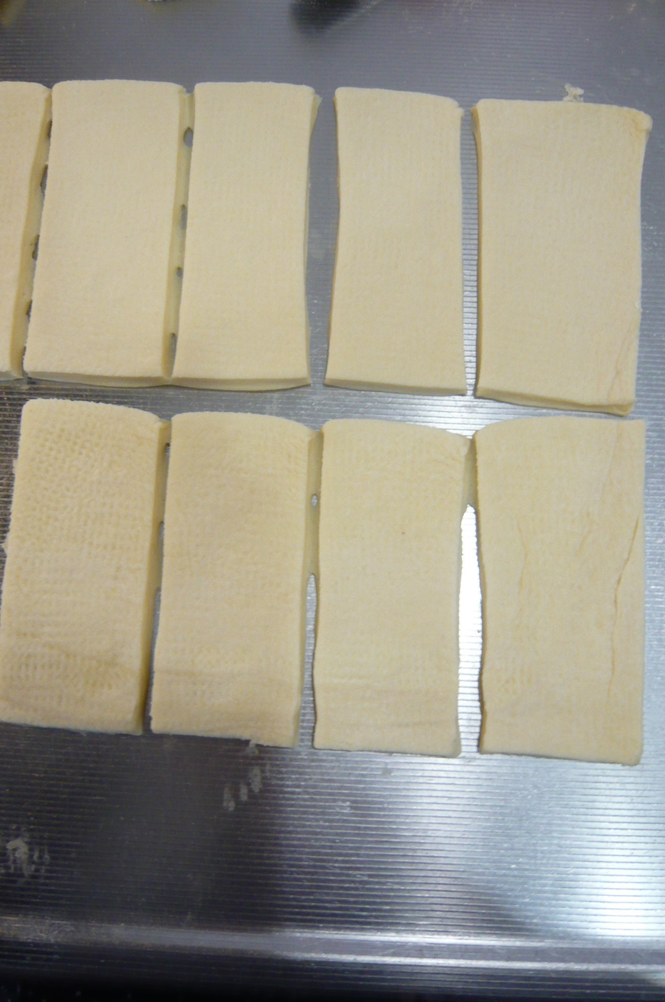 台に打ち粉をして、24cm×42cmに伸ばす。一つが12×7cmの12等分にする。