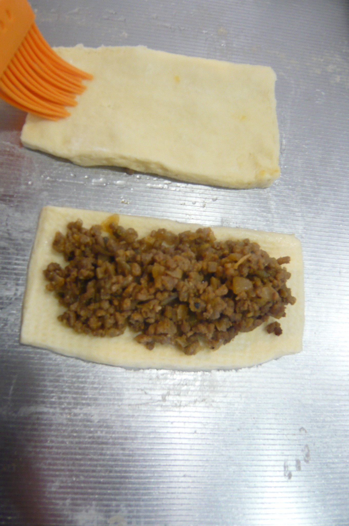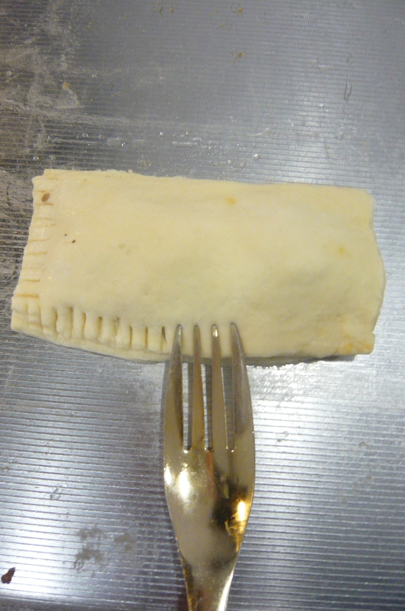 6等分にしたフィリングを4つ端1cm残し生地の上にのせ、上にのせる生地の端に水を刷毛で塗り上にかぶせてフォークで生地をくっつける。