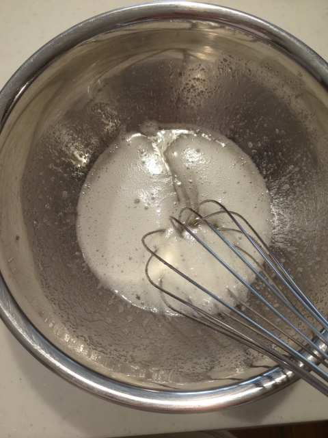 ボウルに卵白を入れ泡立て器でほぐしてからグラニュー糖を加える。