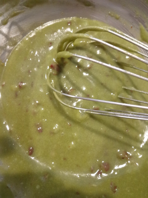 白く泡立ってきたら、アーモンドパウダーと薄力粉、抹茶パウダーを加える。