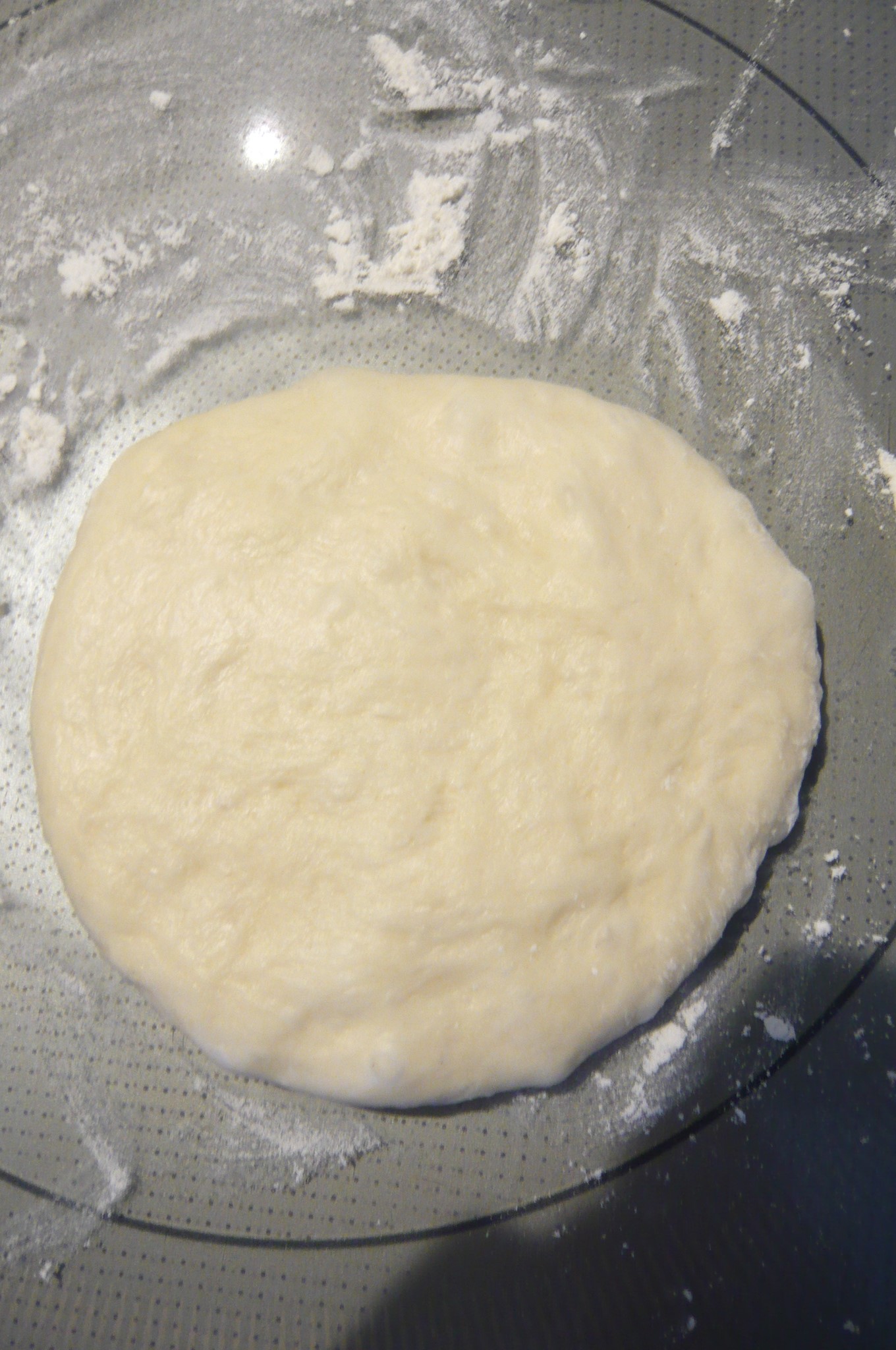 台に打ち粉をし、ガスを抜く。丸めなおし、ボウルに入れ、ラップをし濡れ布巾を掛け冷蔵庫で30分休ませる。